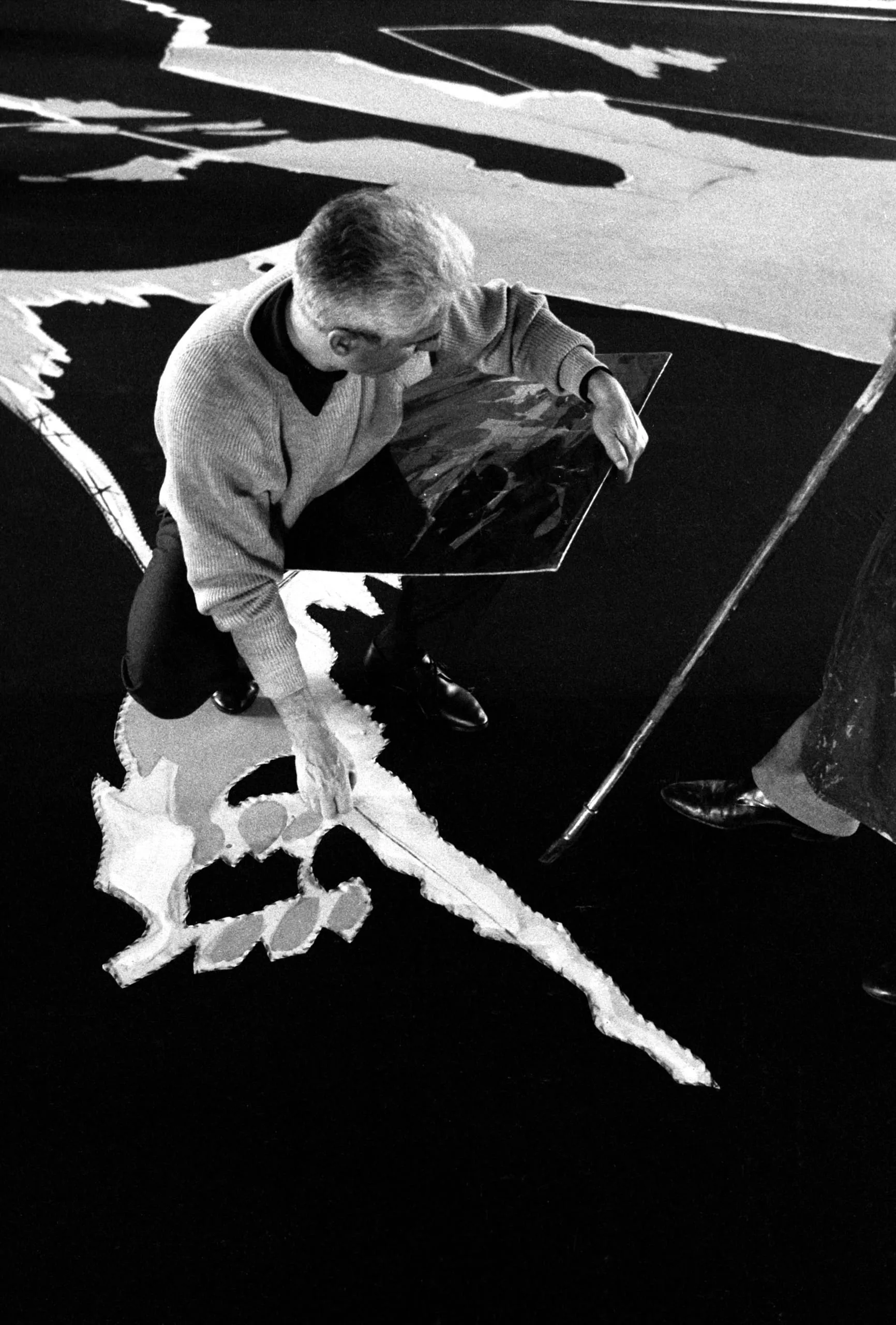 Black and white photograph shot from above, a man with gray hair crouching over a large dark floor canvas with bold white painted forms, holding a small reference panel