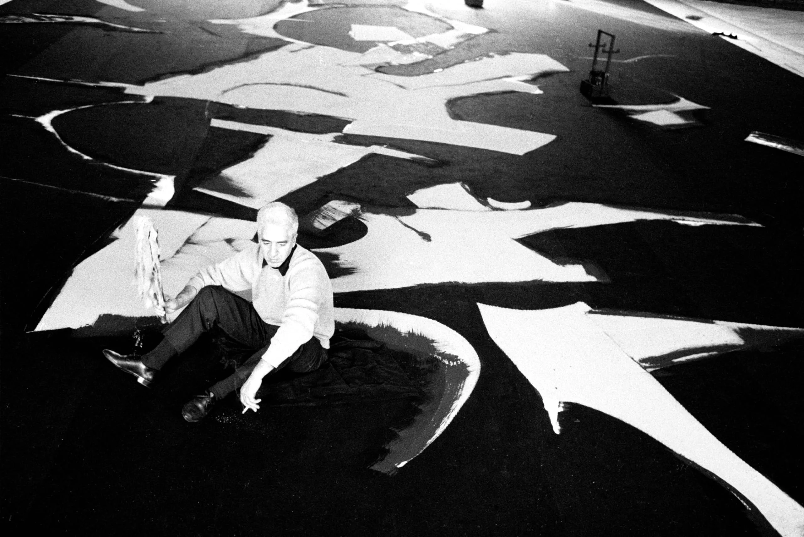 Black and white photograph of a man sitting on a large floor canvas, reaching toward bold black and white painted forms, shot from above