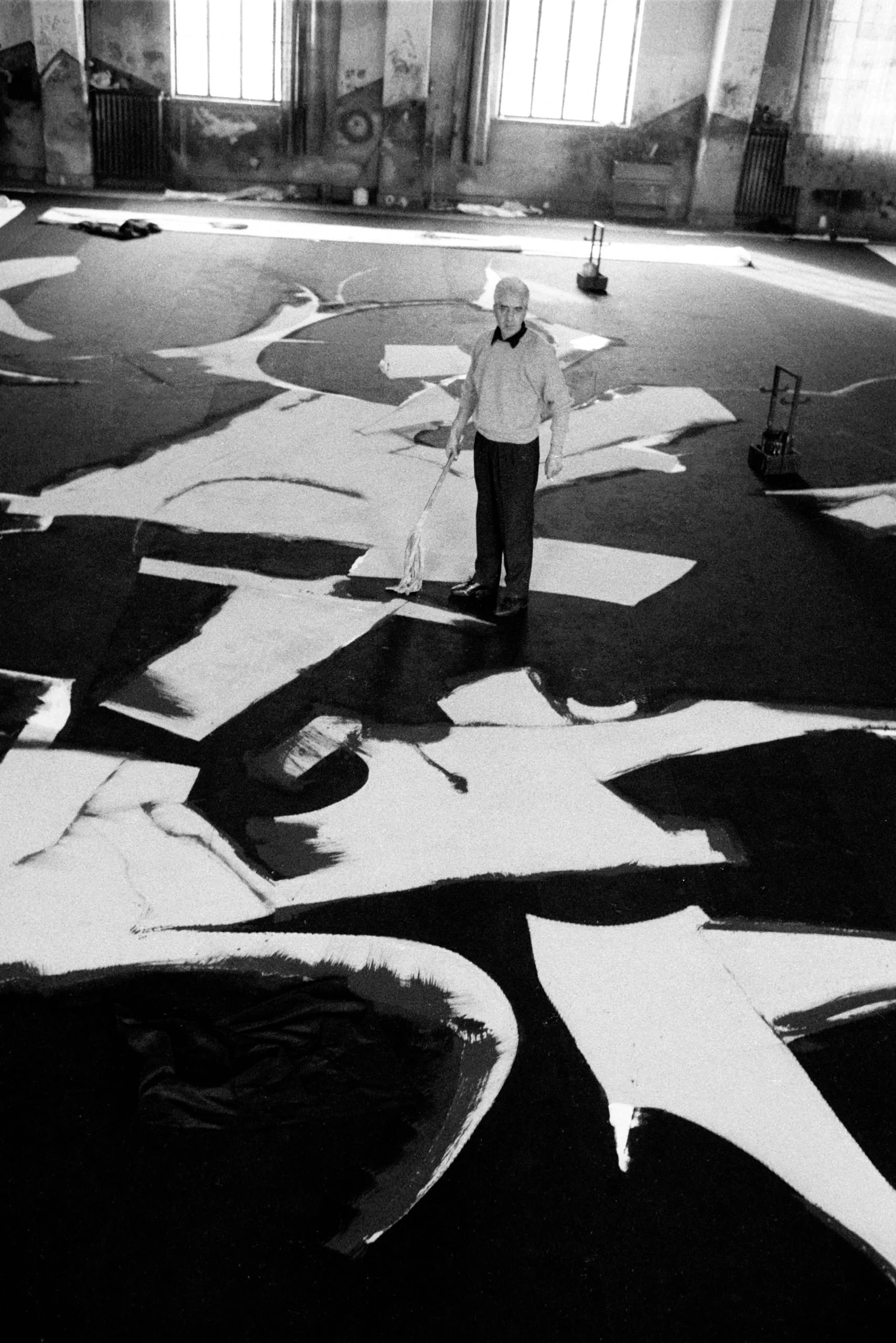 Black and white photograph of a white-haired man standing among enormous black and white painted forms spread across an industrial floor, holding a long-handled brush