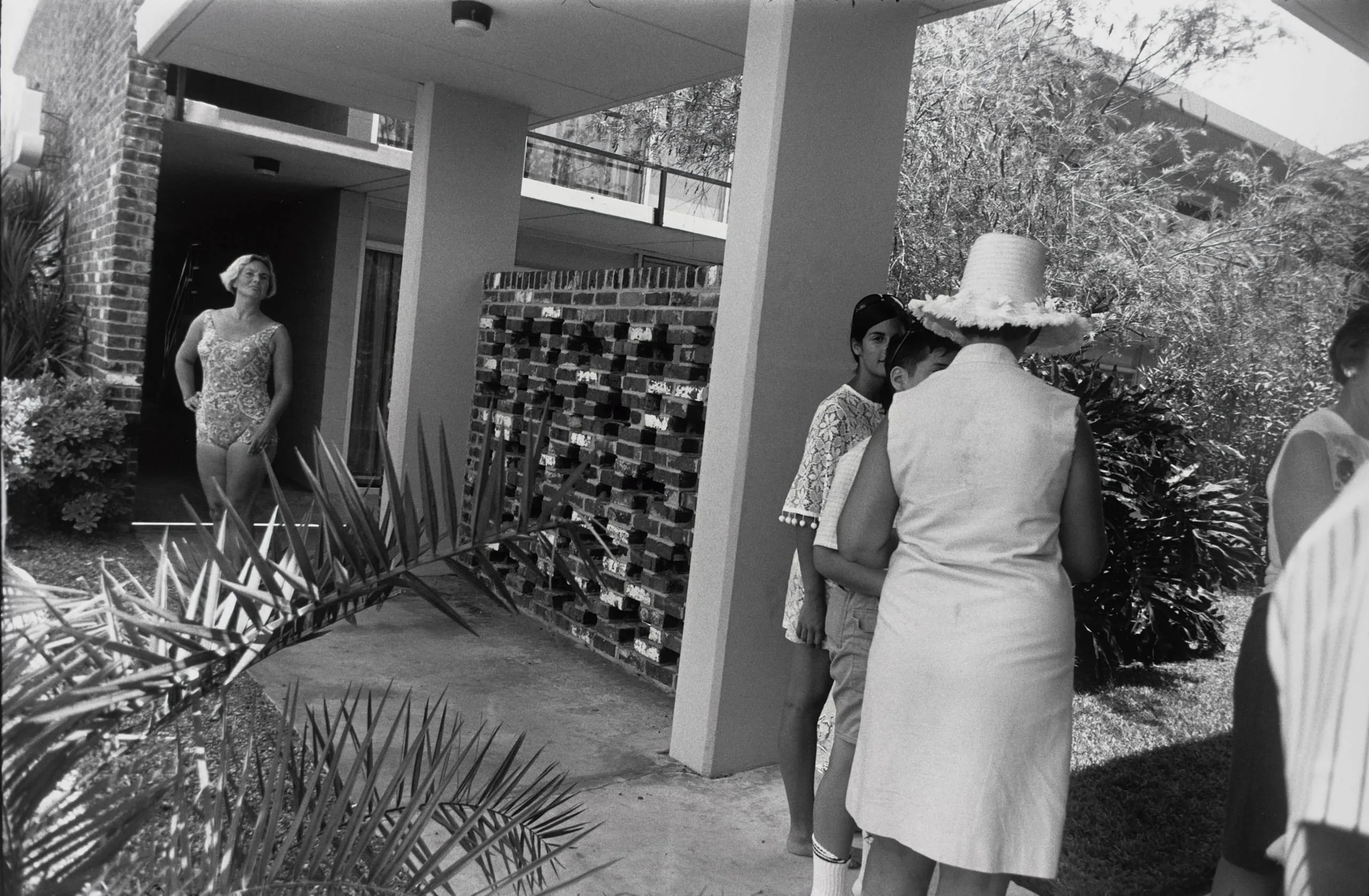 Black and white photograph of a mid-century building exterior with several figures: a woman in a swimsuit standing in a doorway and a group including a woman in a wide-brimmed hat and a child in the foreground