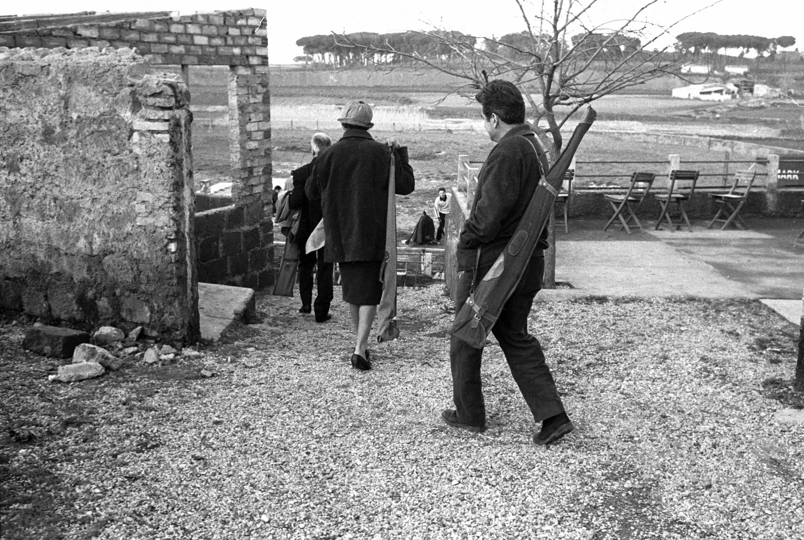 Black and white photograph of several figures seen from behind, walking through a ruined stone doorway onto a wide gravel and grass field, one carrying a long diagonal case