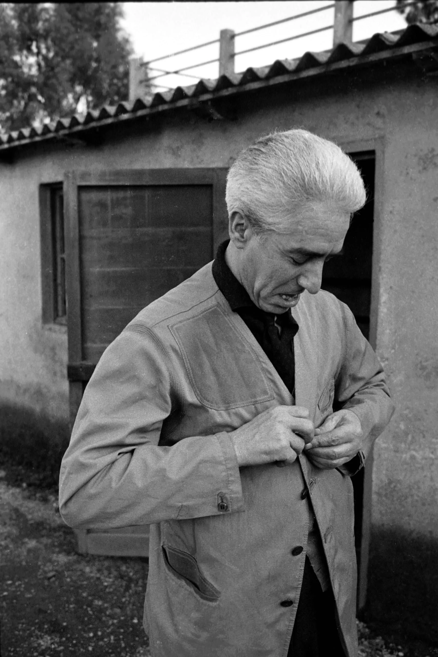 Black and white photograph of a white-haired older man outdoors, head bowed, buttoning a light work jacket in front of a low plastered building