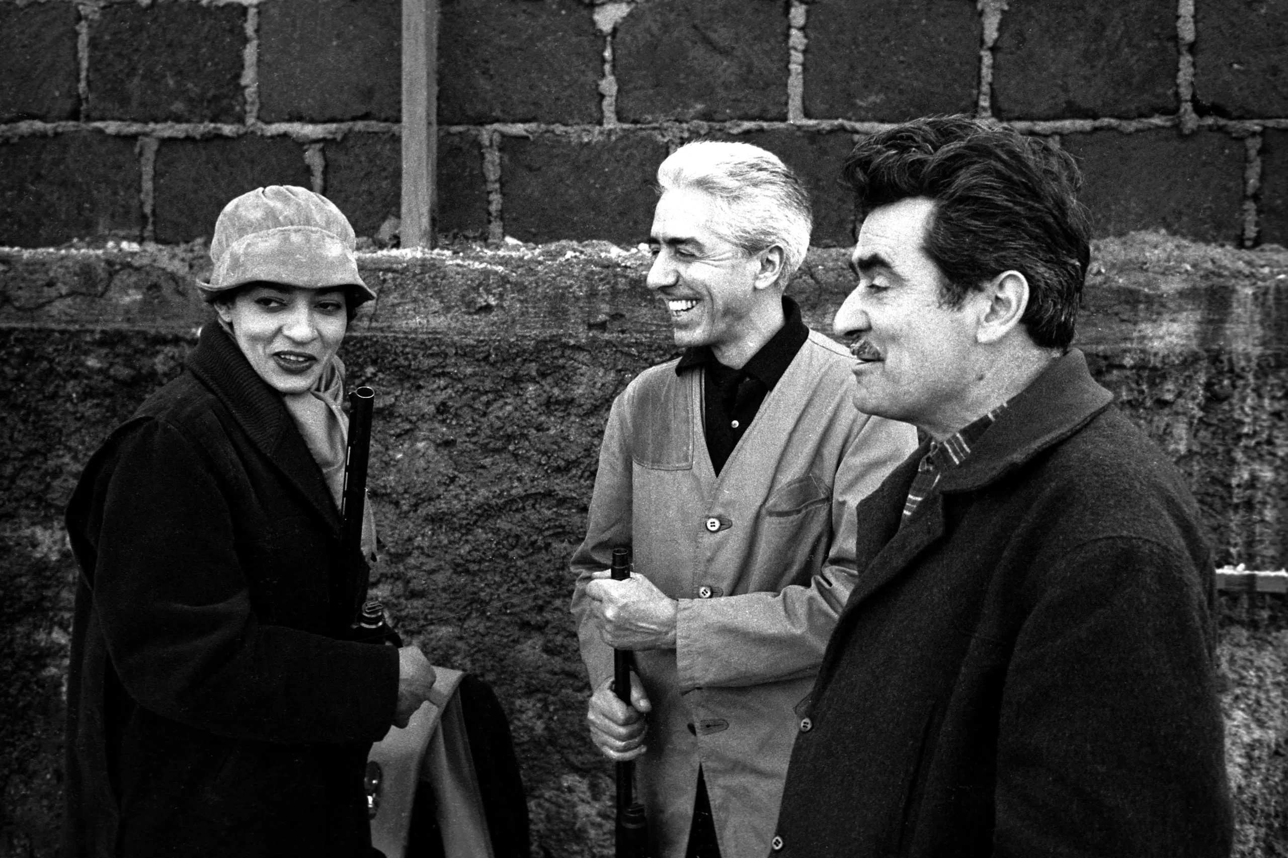 Black and white photograph of three people — a woman in a rounded hat and two men — standing and conversing in front of a rough stone wall