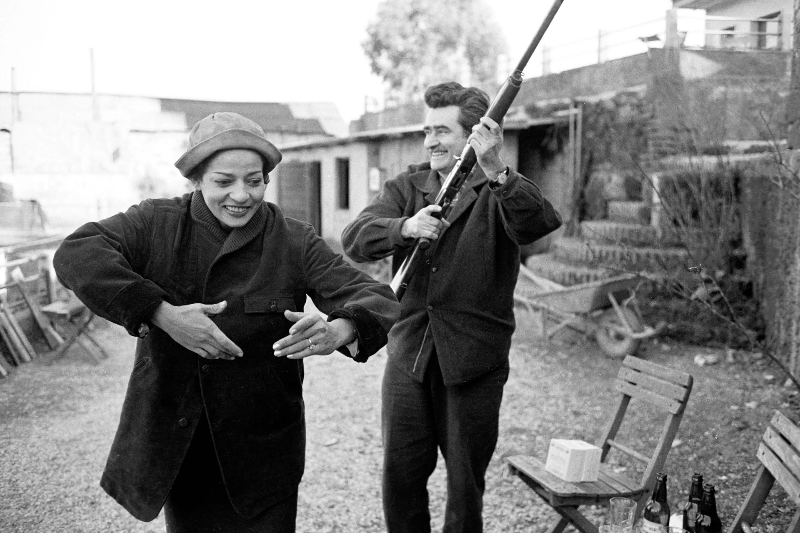 Black and white photograph of a laughing woman leaning forward with arms outstretched and a smiling man holding a raised rifle behind her, in an outdoor courtyard