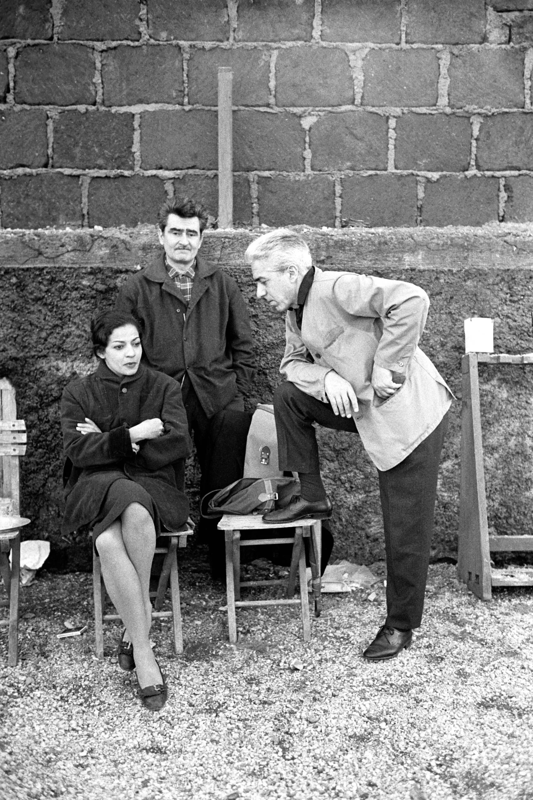 Black and white photograph of three people outdoors against a concrete block wall — a woman seated with arms crossed and two men, one standing behind her and one leaning toward her