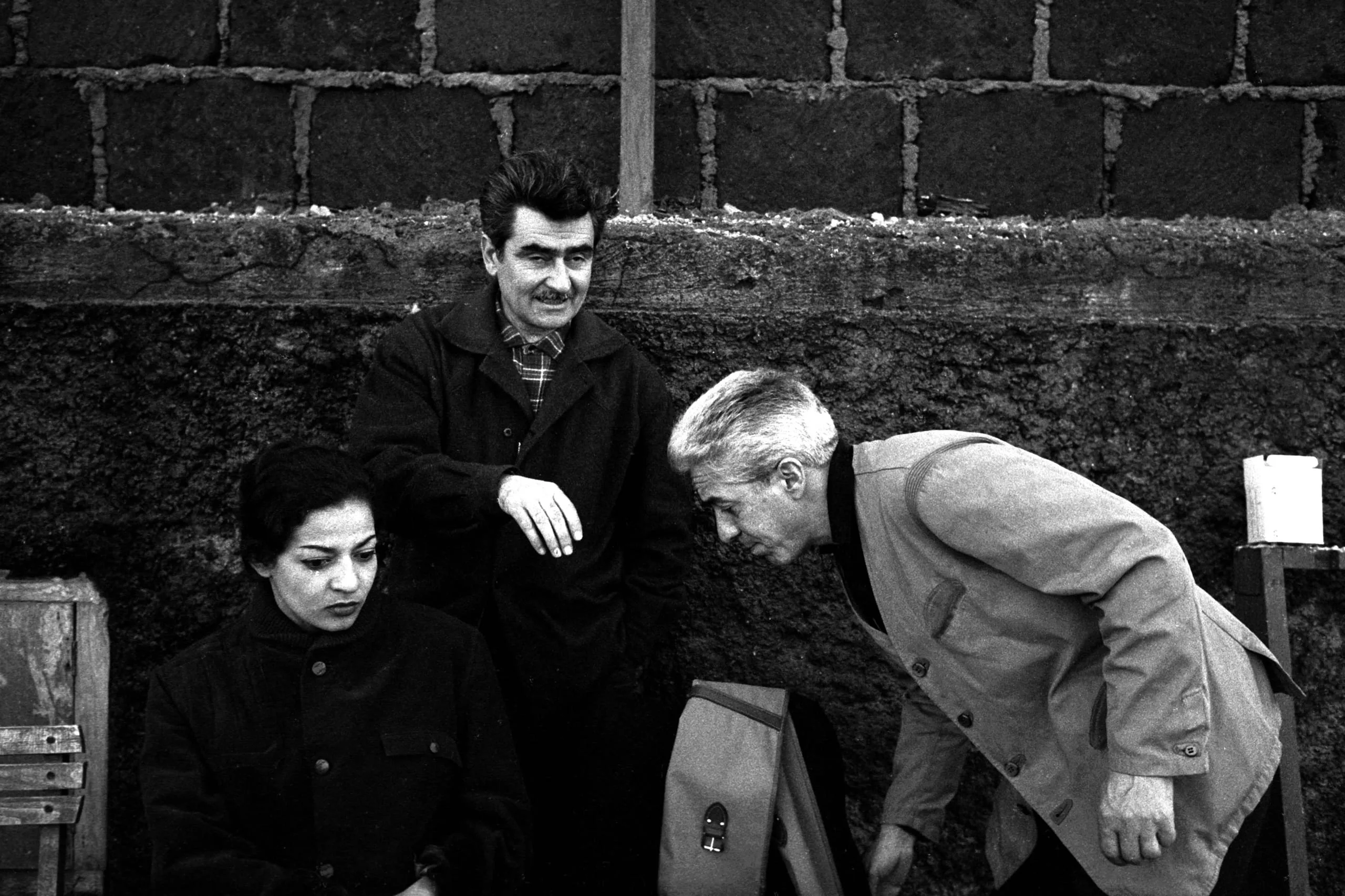 Black and white photograph of three people against a rough stone wall — a seated woman looking down, a standing man with a mustache looking at the camera, and an older man leaning forward