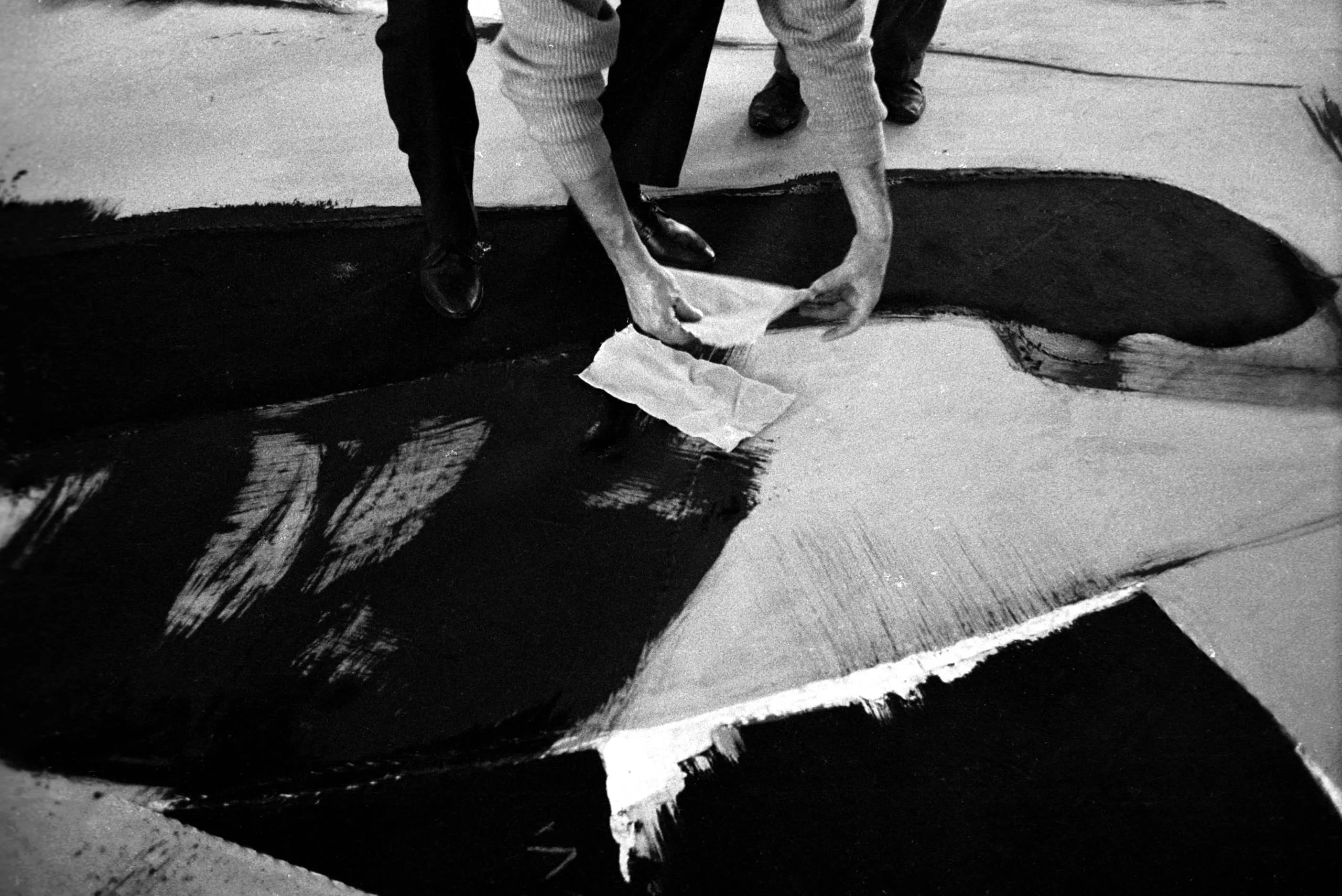 Black and white photograph looking down onto a large canvas on the floor with broad black paint strokes, as a figure in a light sweater presses paper against the wet surface
