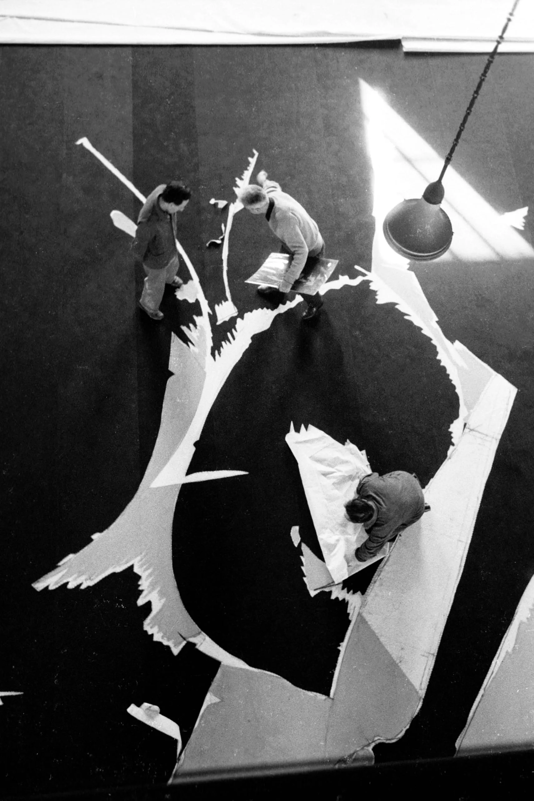Black and white photograph shot from directly overhead, showing three figures standing and crouching over a large abstract black-and-white cut-paper composition spread across a floor