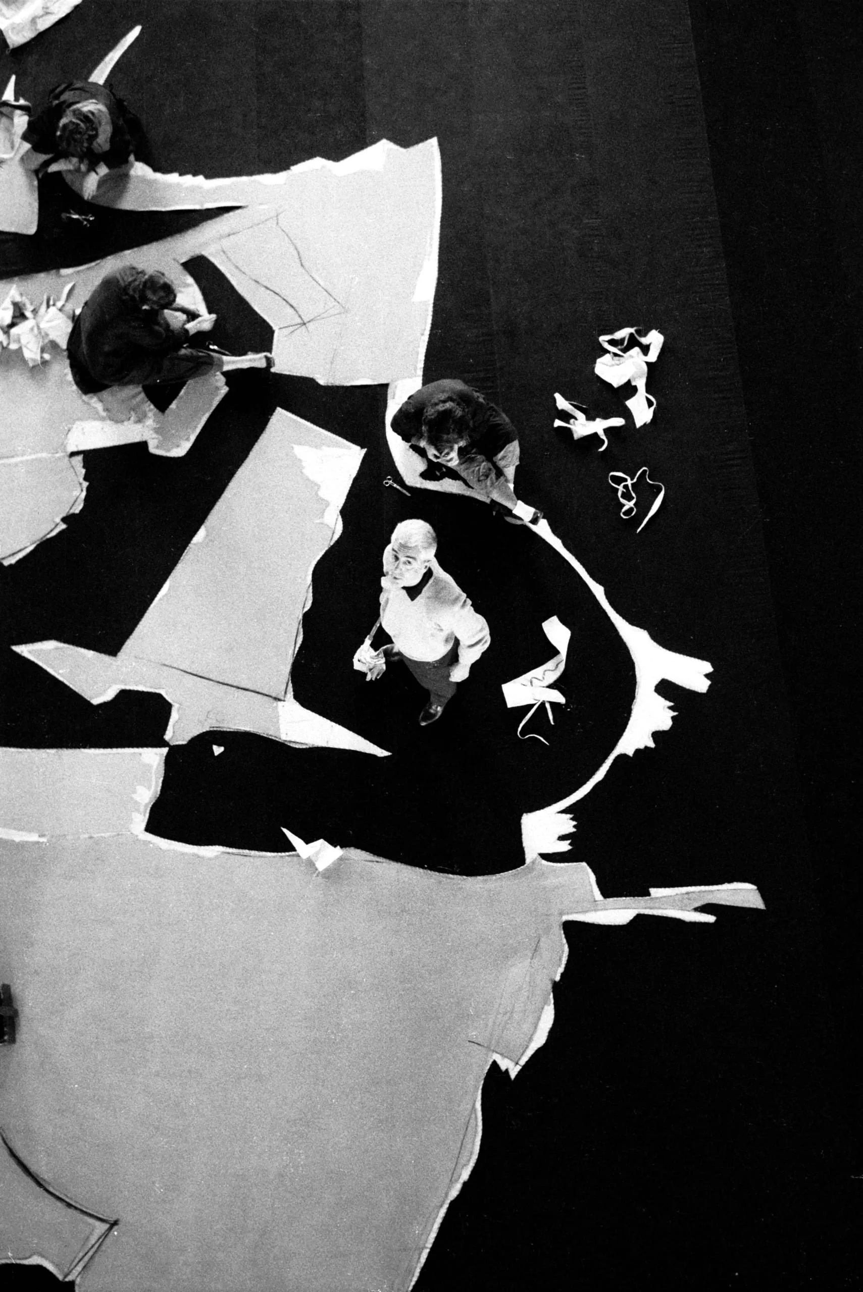 Black and white photograph shot from directly overhead, showing three people working among large torn white paper shapes on a dark floor, one figure looking up at the camera