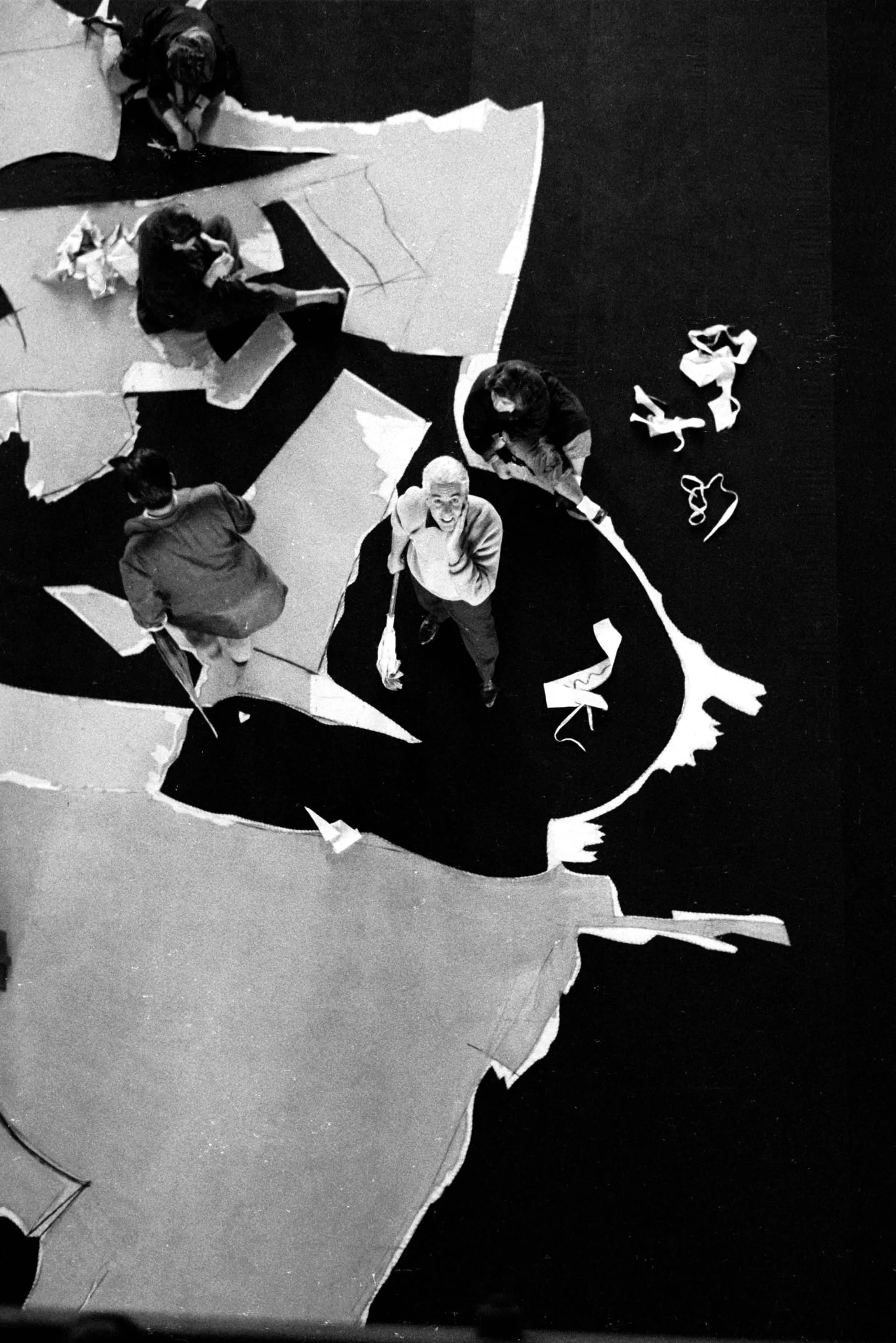 Overhead black and white photograph of four figures on a dark floor surrounded by large torn white paper sheets and small cut paper shapes
