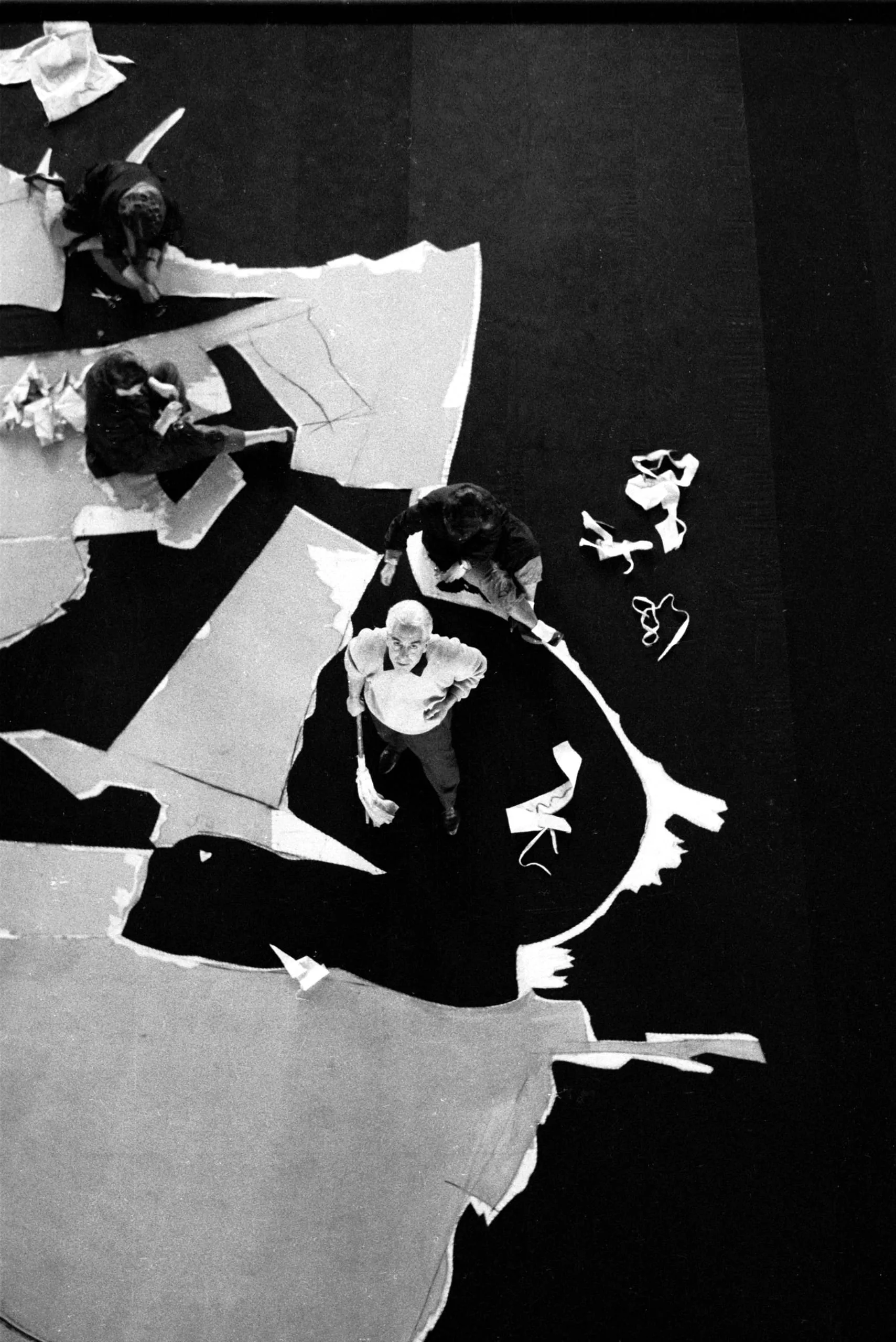 Overhead black and white photograph of three figures standing among large torn sheets of white paper on a dark floor, one person looking up at the camera
