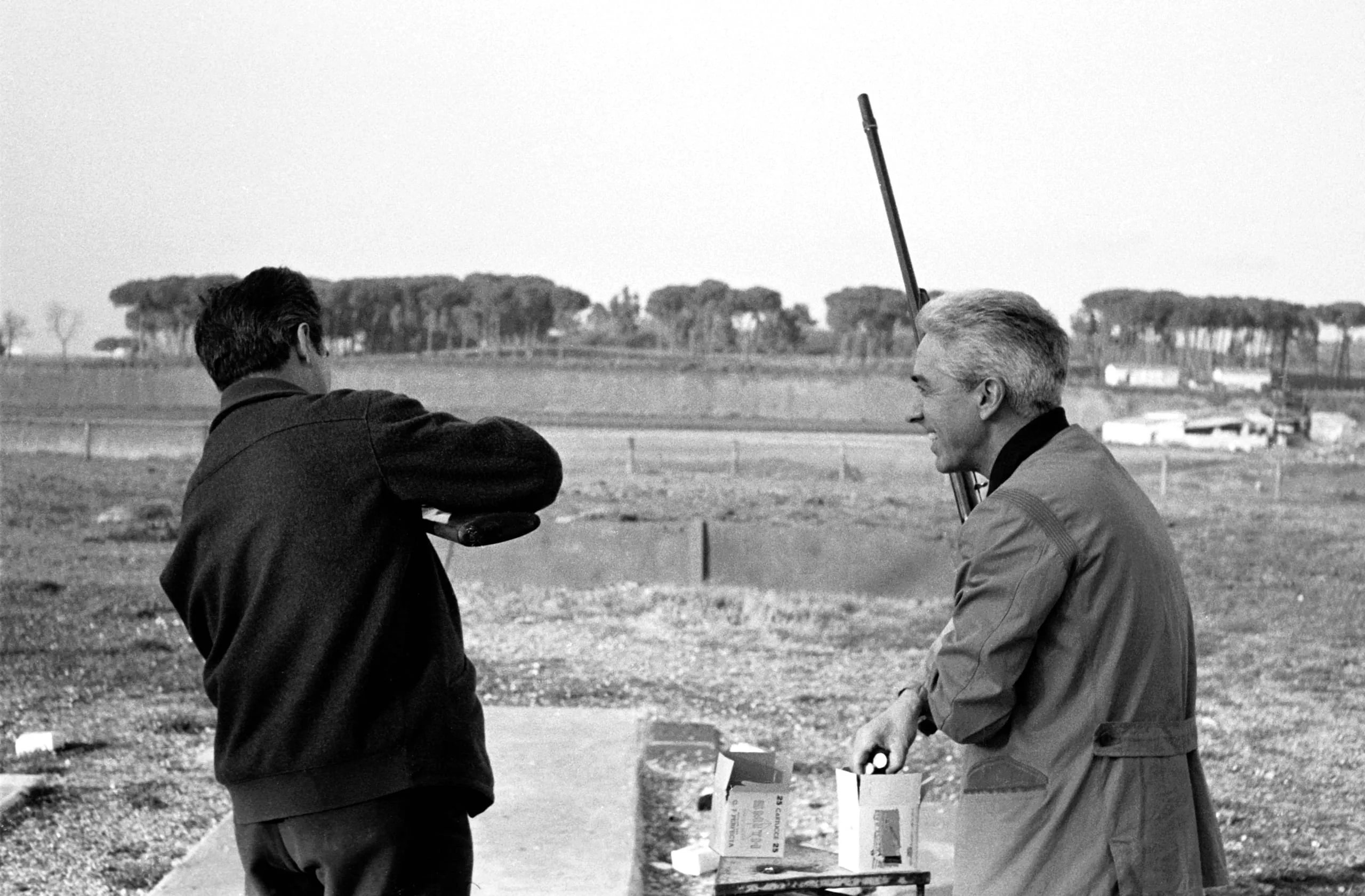 Black and white photograph of two men outdoors, backs to the camera, one pointing toward a flat landscape with stone pine trees on the horizon
