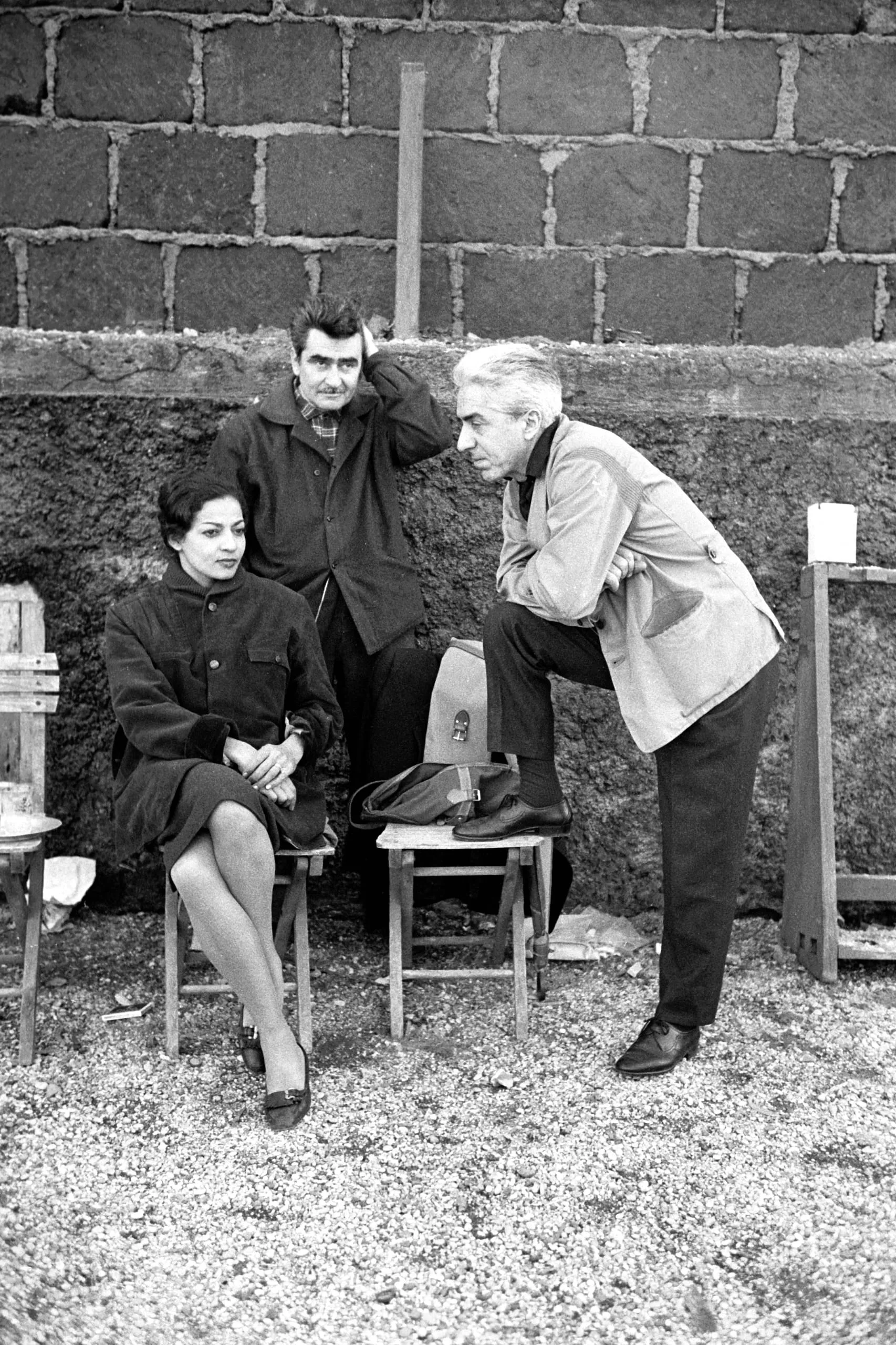 Black and white photograph of three people outdoors against a stone wall — a seated woman and two men, one leaning toward her in conversation