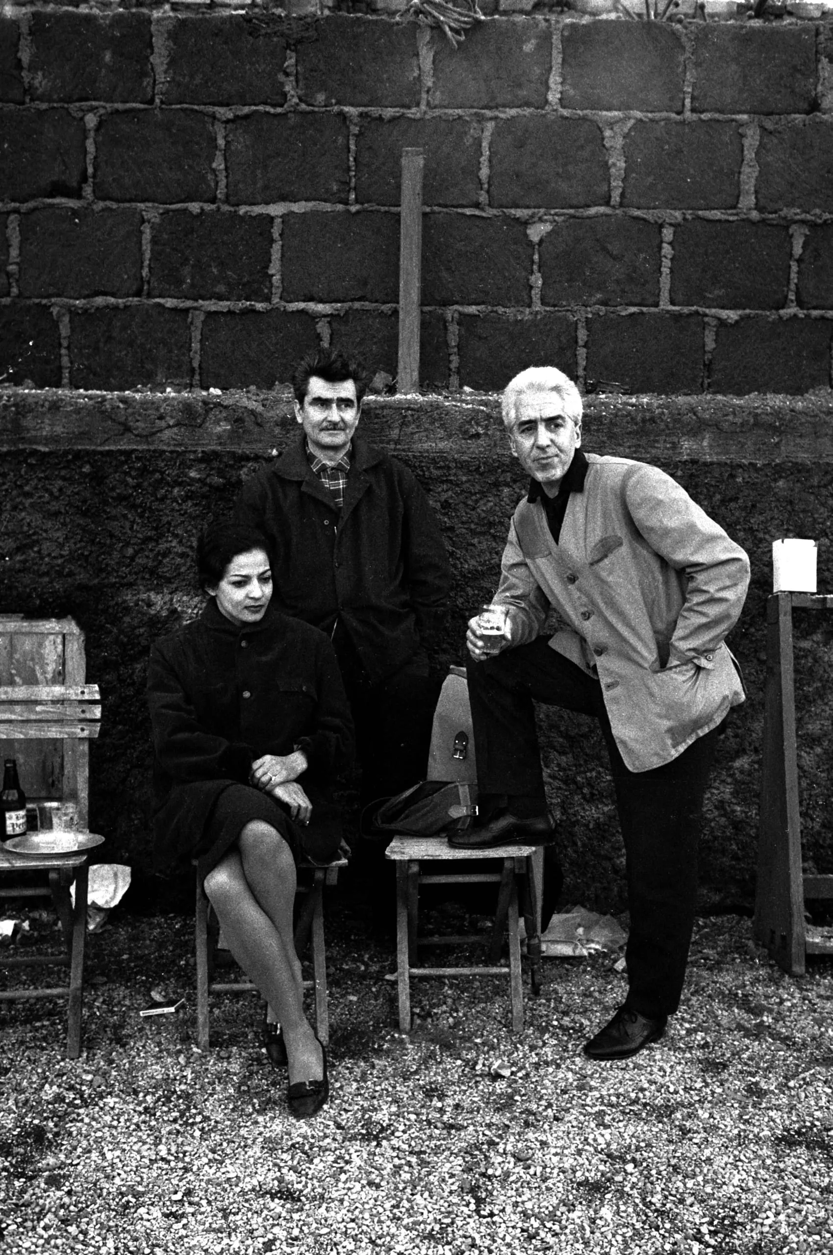 Black and white photograph of three people — a seated woman and two standing men — posed in front of a cinder-block wall on a gravel surface