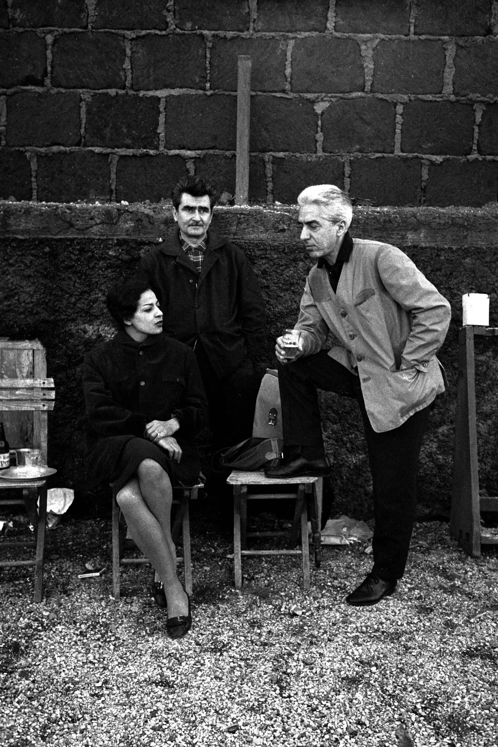 Black and white photograph, three people outdoors against a stone wall — a woman seated in a folding chair and a man leaning toward her, a third man standing behind