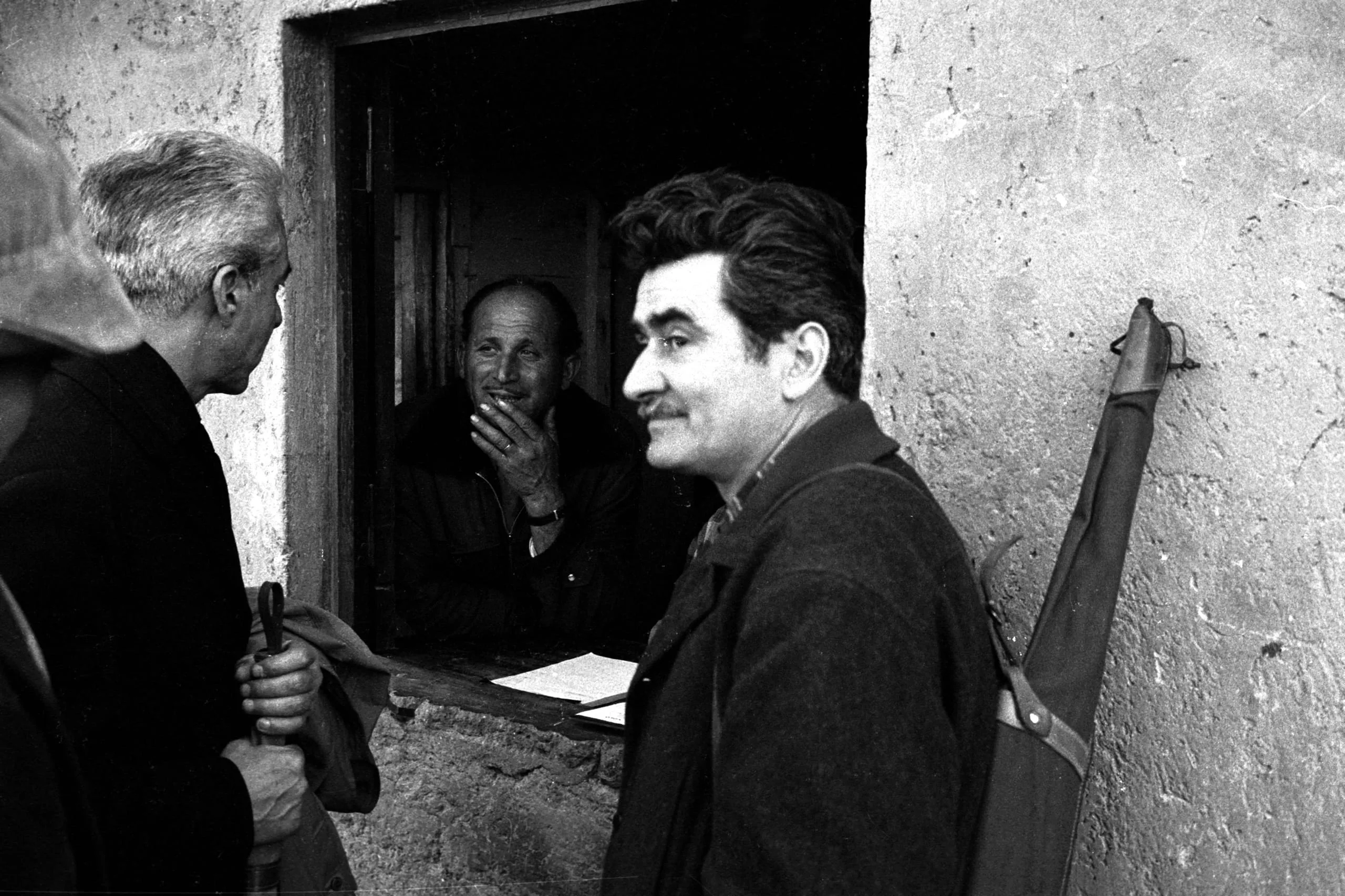 Black and white photograph of three men at a building doorway, two holding rifles, shot in soft diffused light