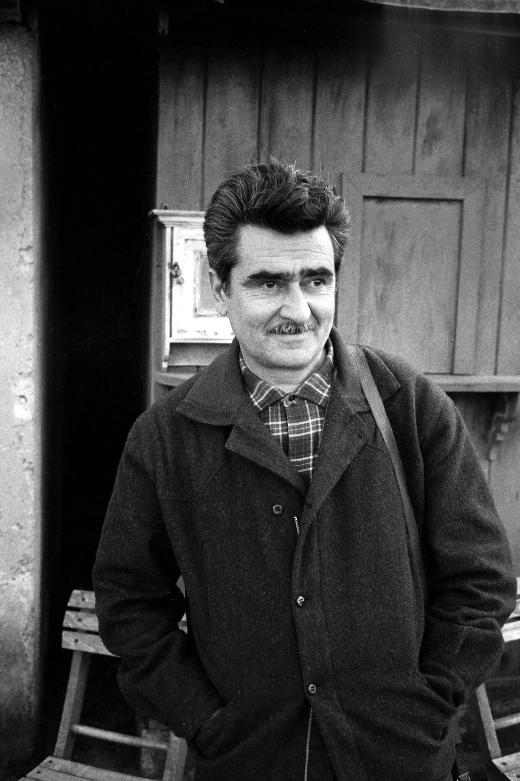 Black and white photograph, waist-up portrait of a dark-haired man with a mustache in a wool overcoat and plaid shirt, standing before a wooden door