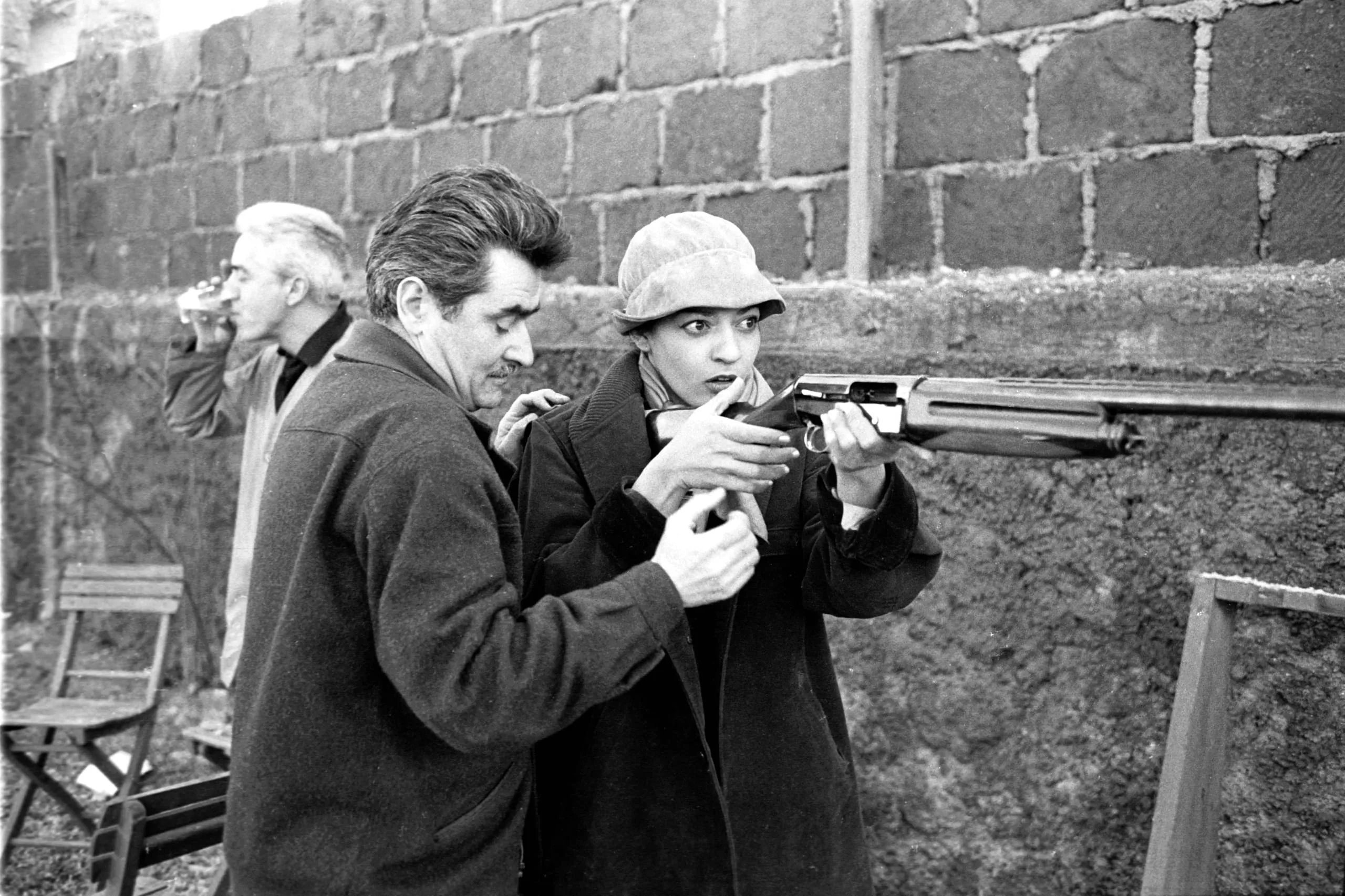Black and white photograph of a man guiding a woman aiming a rifle, both in dark overcoats, against a concrete block wall