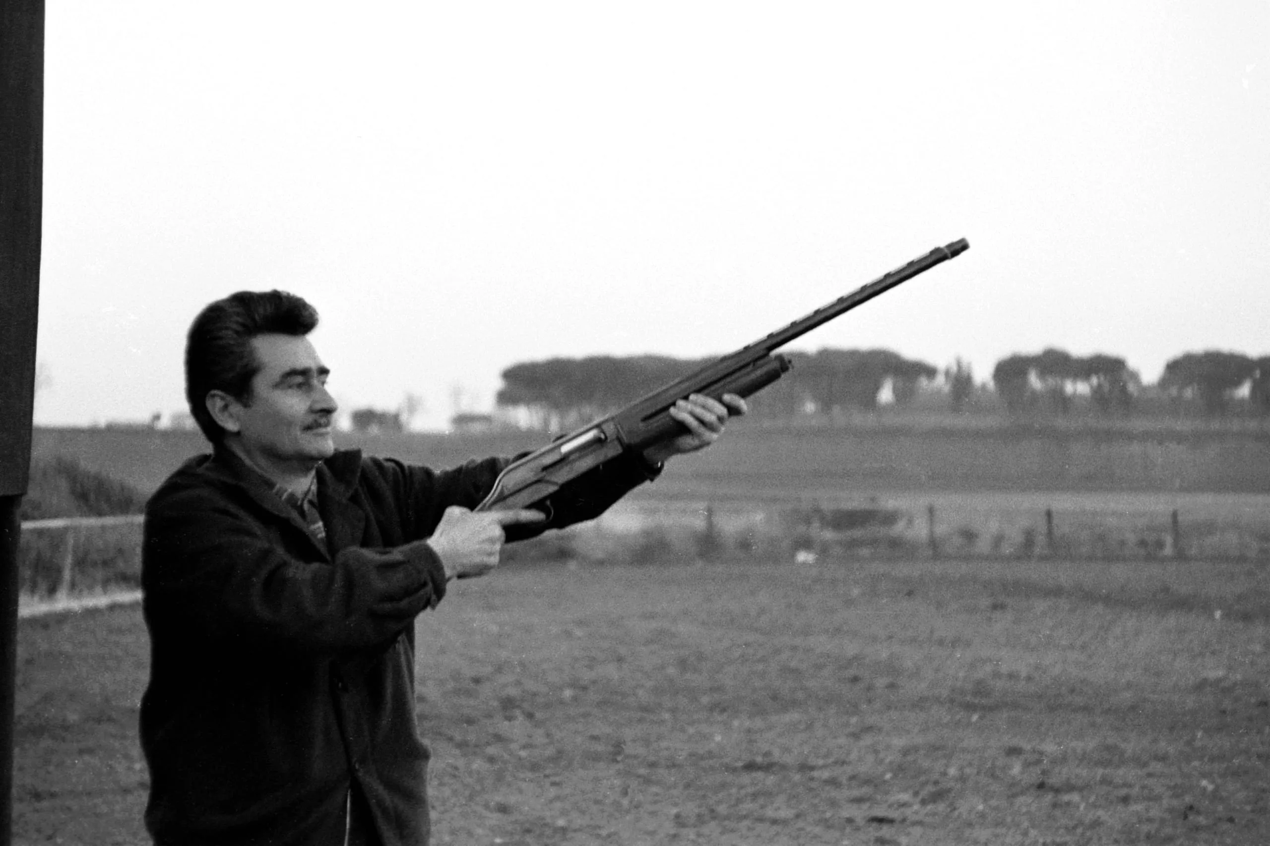 Black and white photograph of a man in a dark jacket aiming a shotgun diagonally upward across the frame, with flat fields and pine trees in the distance