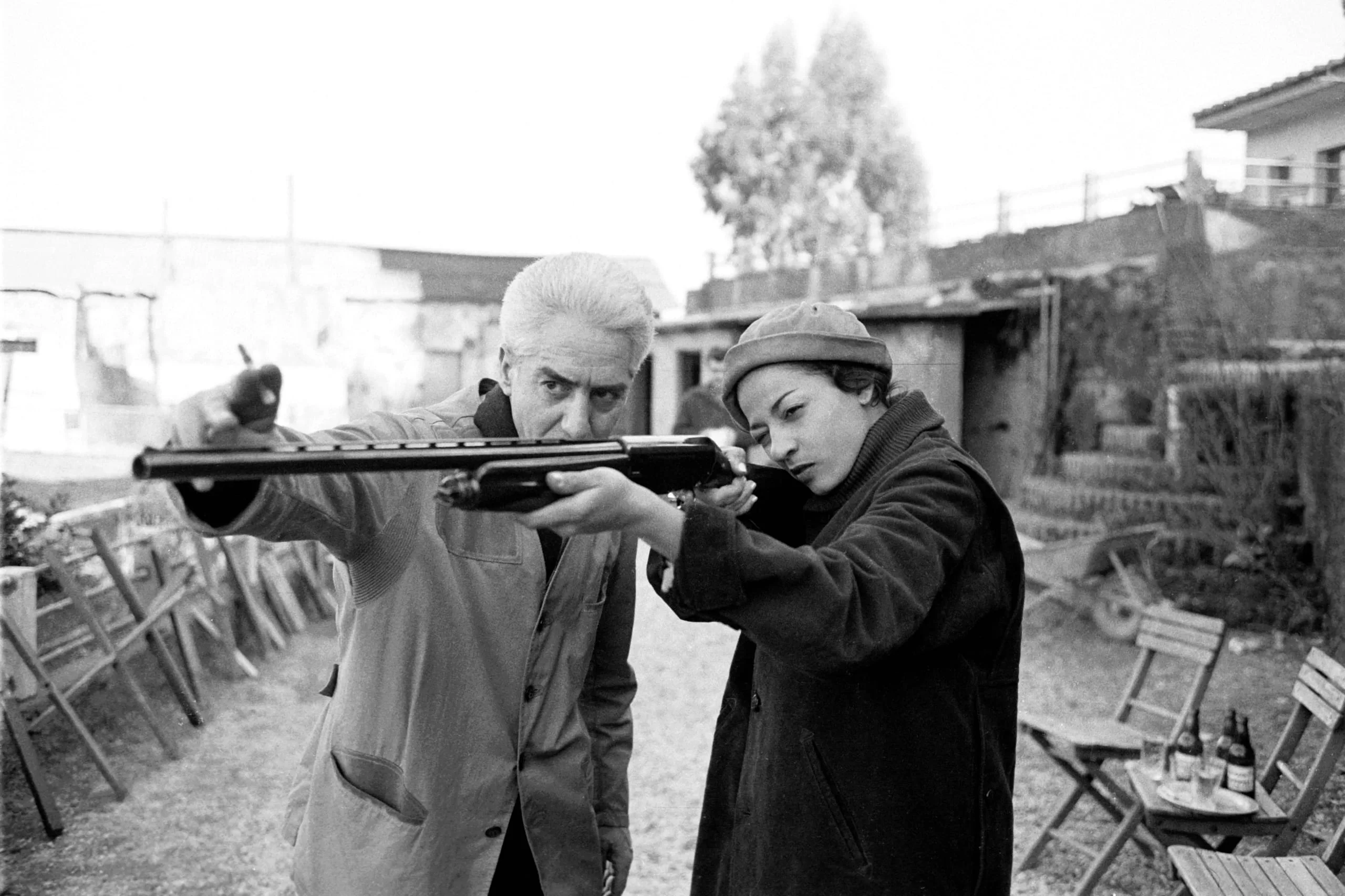 Black and white photograph of a white-haired man and a woman in a beret aiming a long rifle together outdoors, in a yard with folding chairs