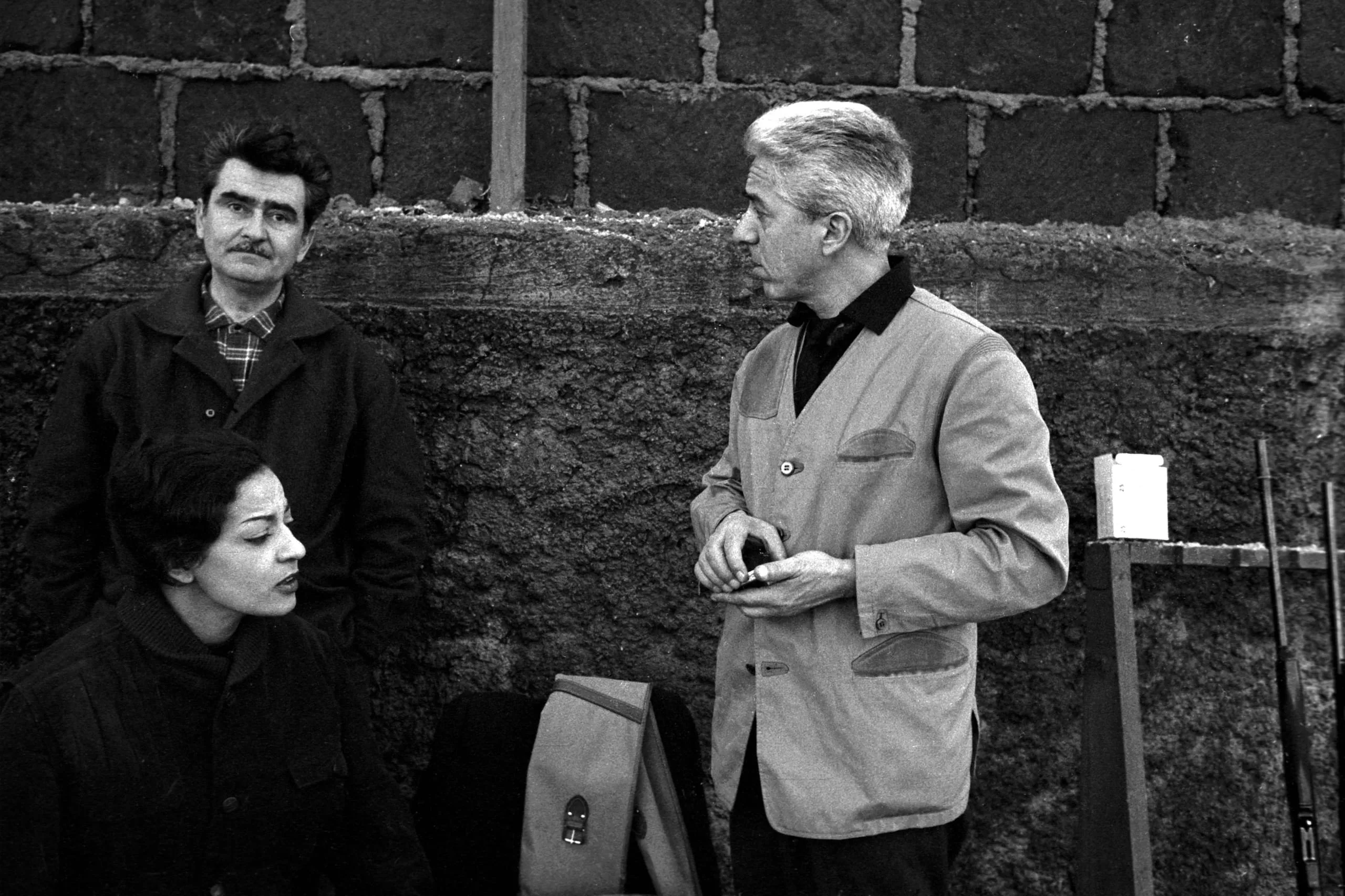 Black and white photograph of three people — a seated woman and two standing men — outdoors against a rough stone wall, in soft diffused light