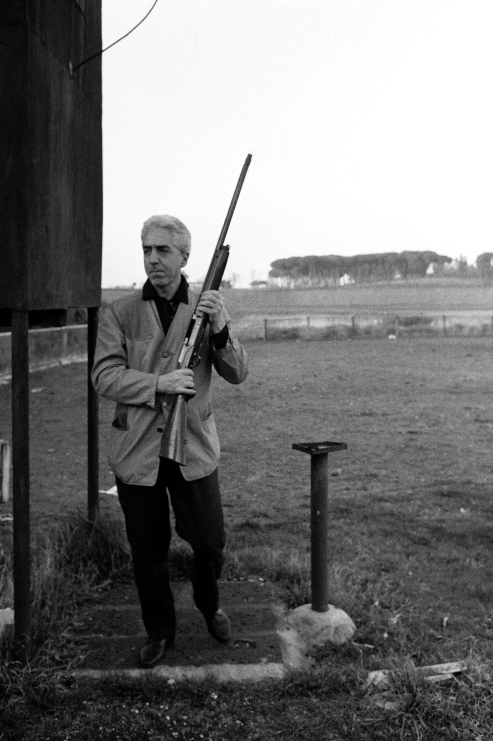 Black and white photograph, full-length portrait of a gray-haired man in a light jacket holding a rifle upright beside a post, open field and pine trees in the distance