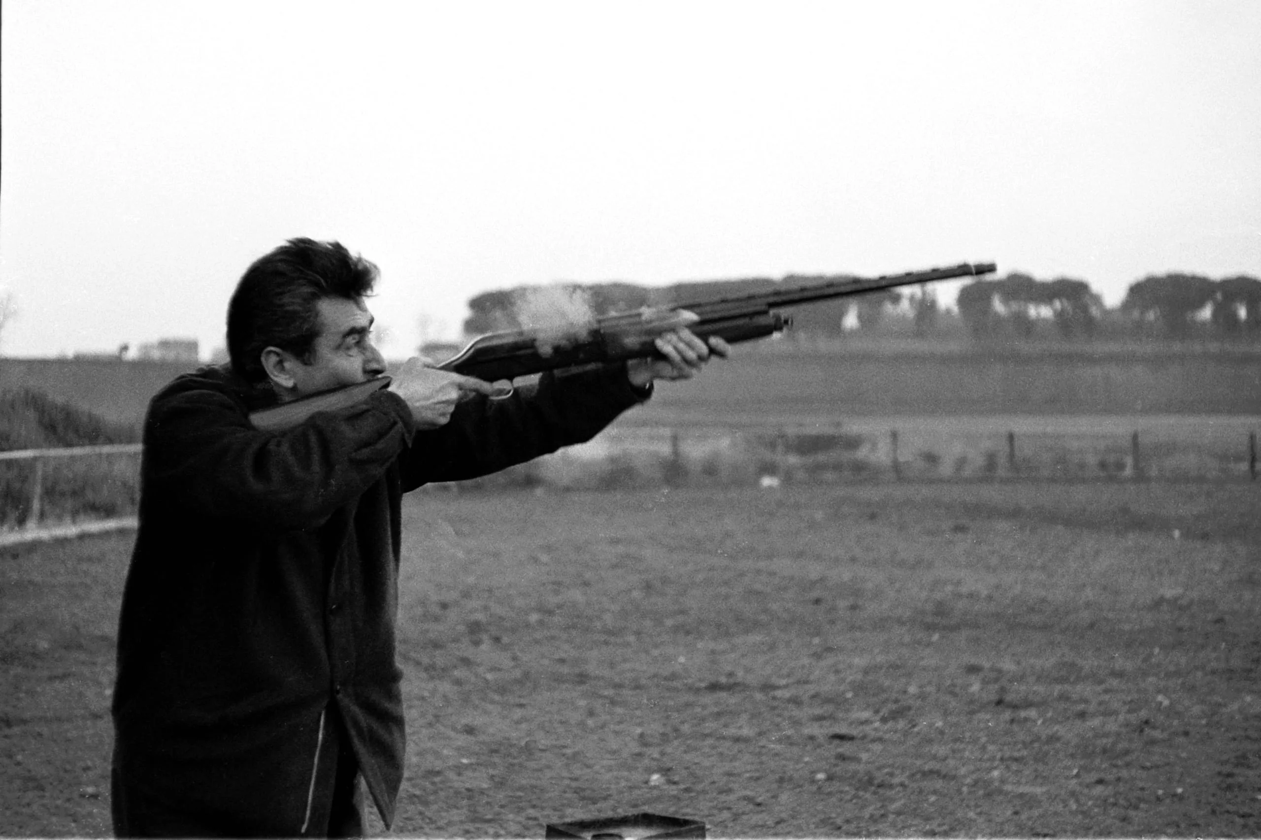 Black and white photograph of a man in a dark jacket firing a shotgun toward the right, smoke visible at the muzzle, flat grassy field and distant treeline behind him