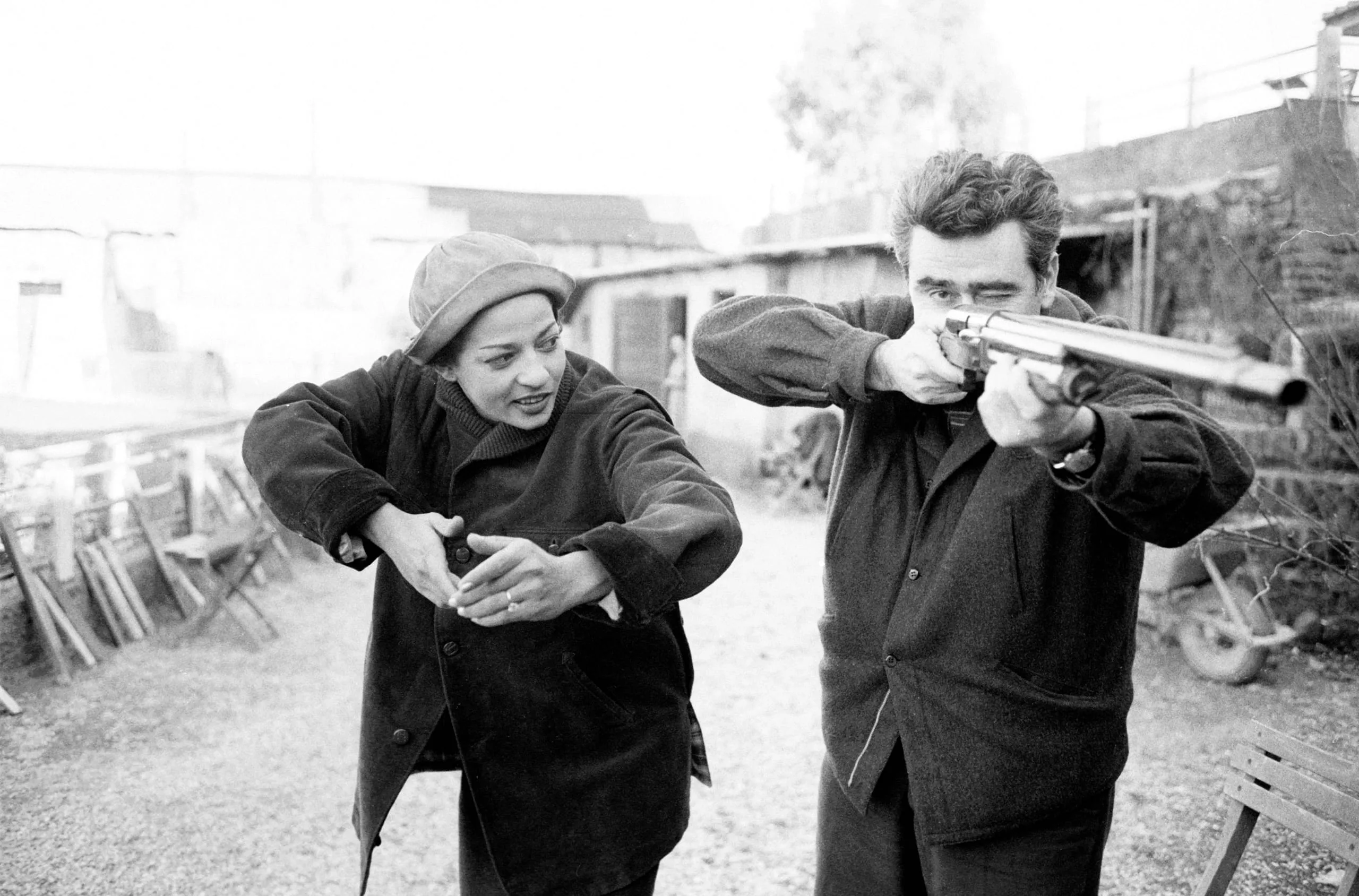 Black and white photograph of a man aiming a silver revolver toward the camera while a woman beside him mimics a shooting stance, outdoors