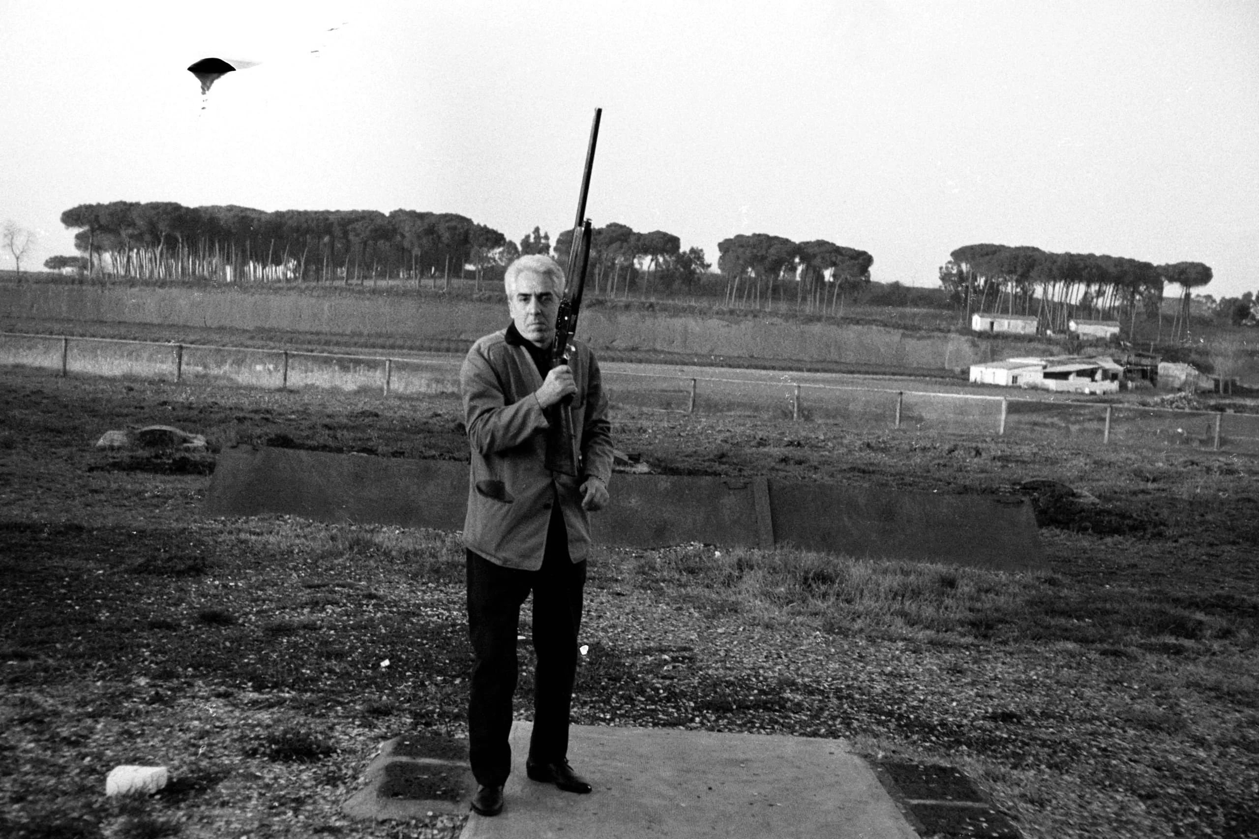 Black and white photograph of a gray-haired man in a light jacket standing on a concrete pad, holding a rifle upright, with flat scrubland and pine trees behind him