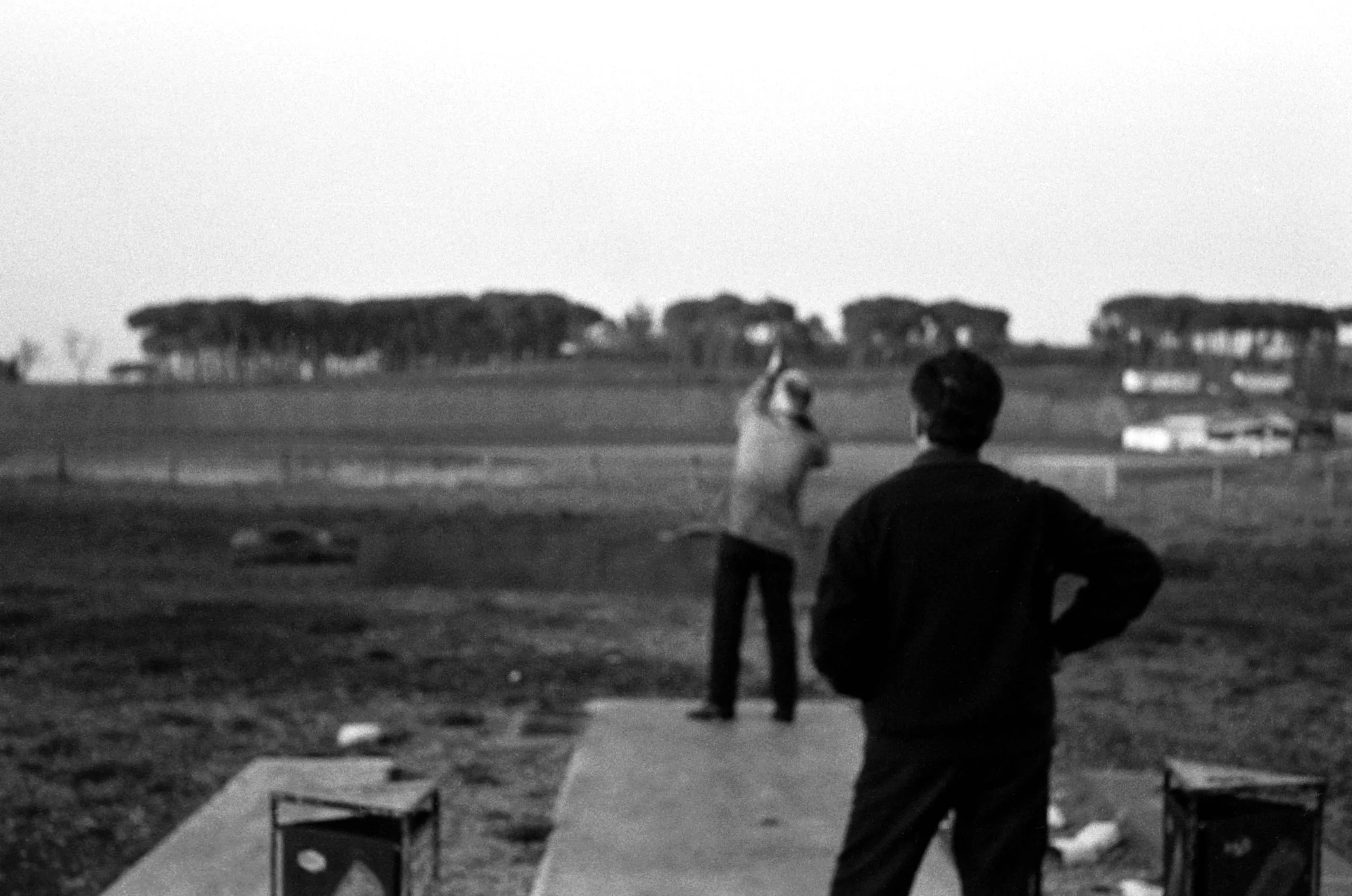 Grainy black and white photograph of two figures on an outdoor driving range, one mid-swing in the distance, another watching from behind with hands on hips