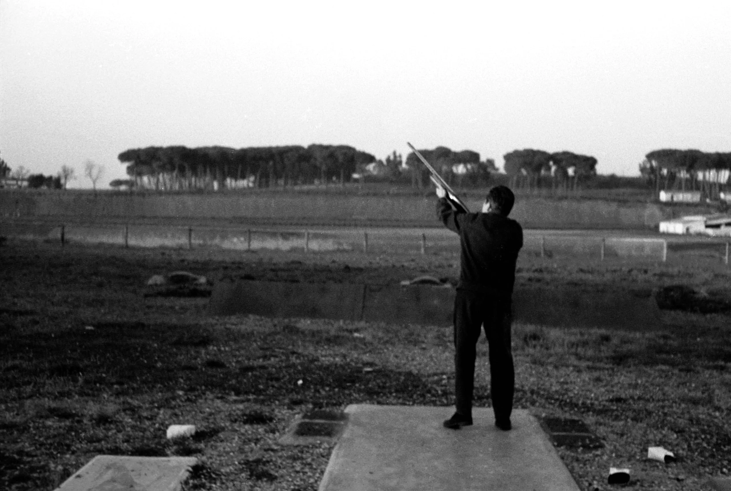 Black and white photograph of a man in dark clothing standing on a concrete platform, aiming a long gun upward against a flat open landscape with a row of trees on the horizon