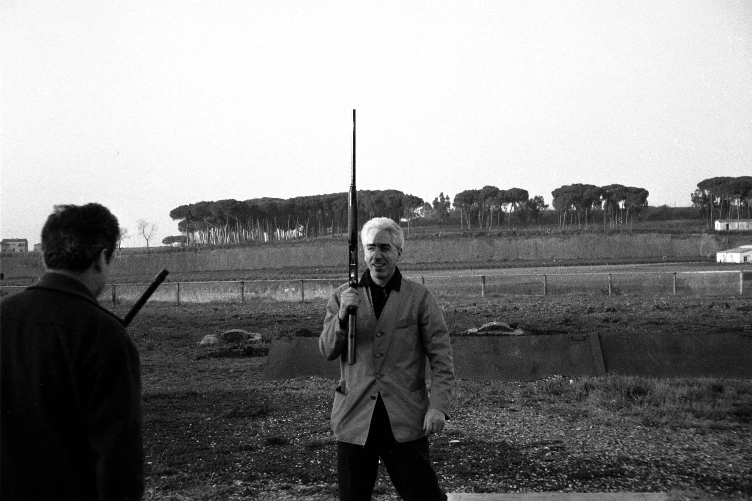 Black and white photograph of two men in an open field, one facing away holding a rifle at his side, the other facing forward holding a rifle upright