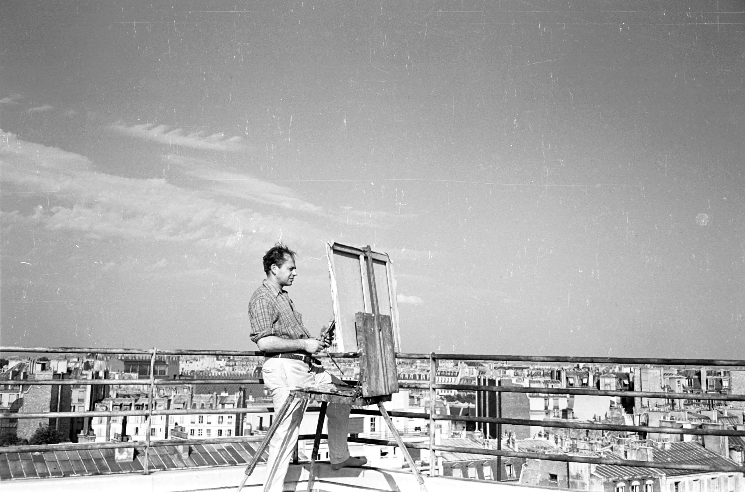 Black and white photograph of a man in a plaid shirt standing on a stepladder to paint at an easel on a rooftop, with a cityscape below and open sky above
