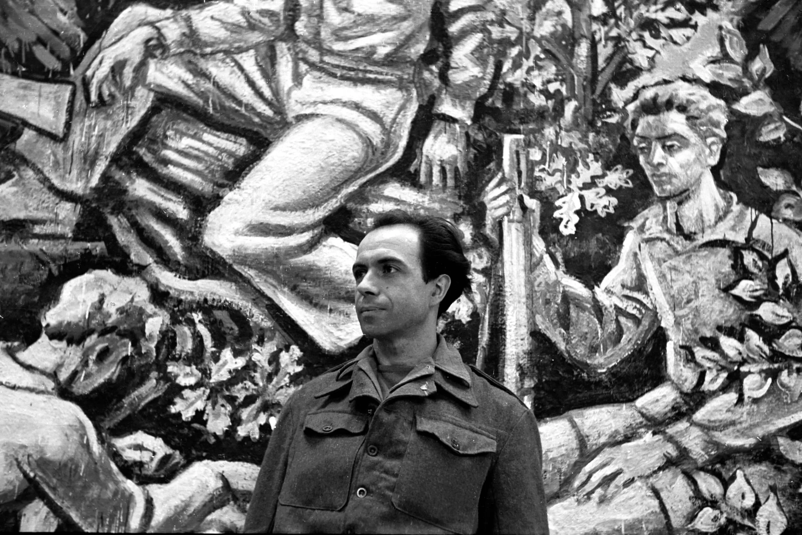 Black and white photograph of a dark-haired man in a field jacket standing before a large figurative mural with bold, gestural brushwork