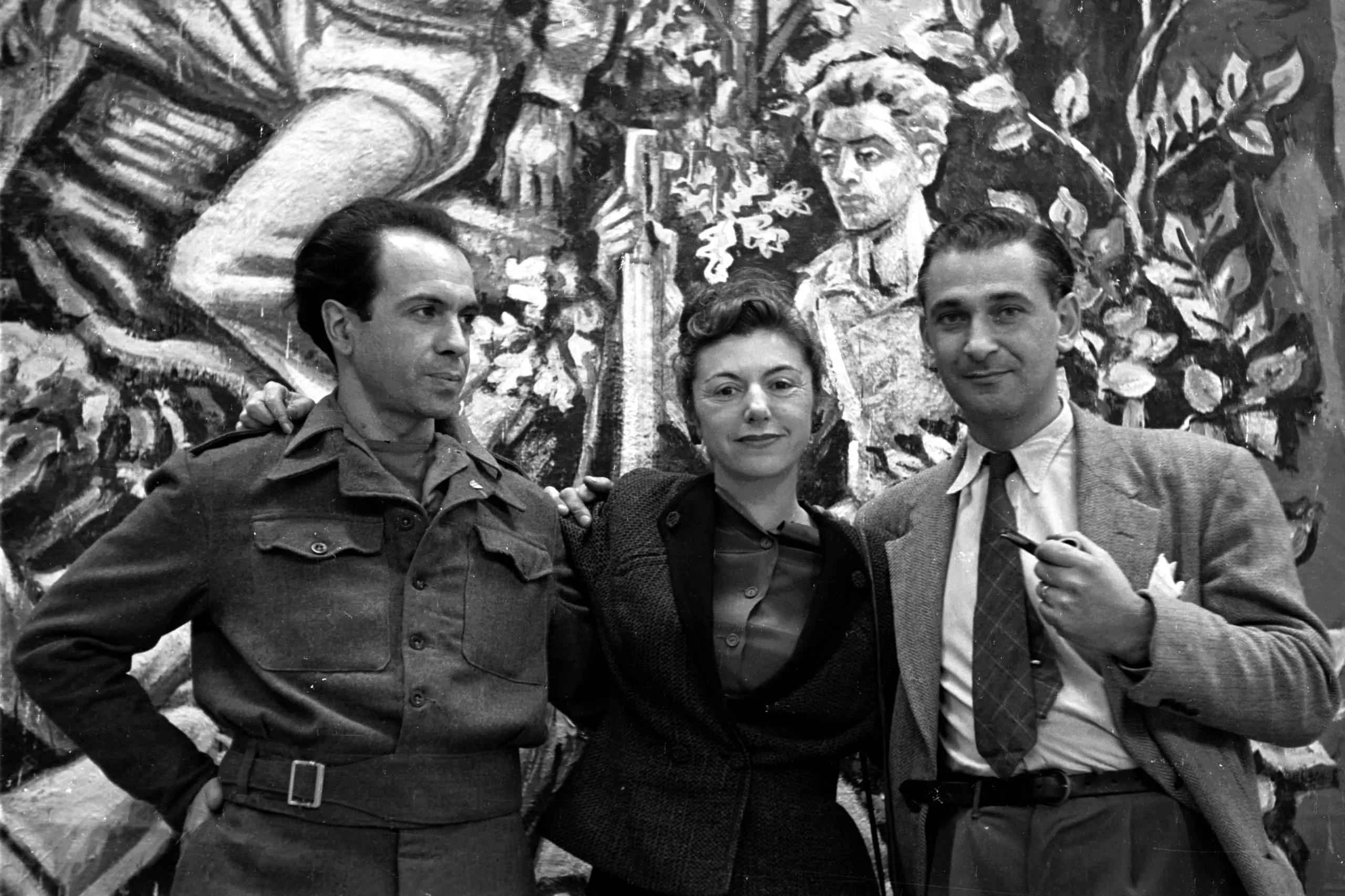 Black and white photograph of two men and a woman standing together from the waist up in front of a large figurative painting with loose brushwork