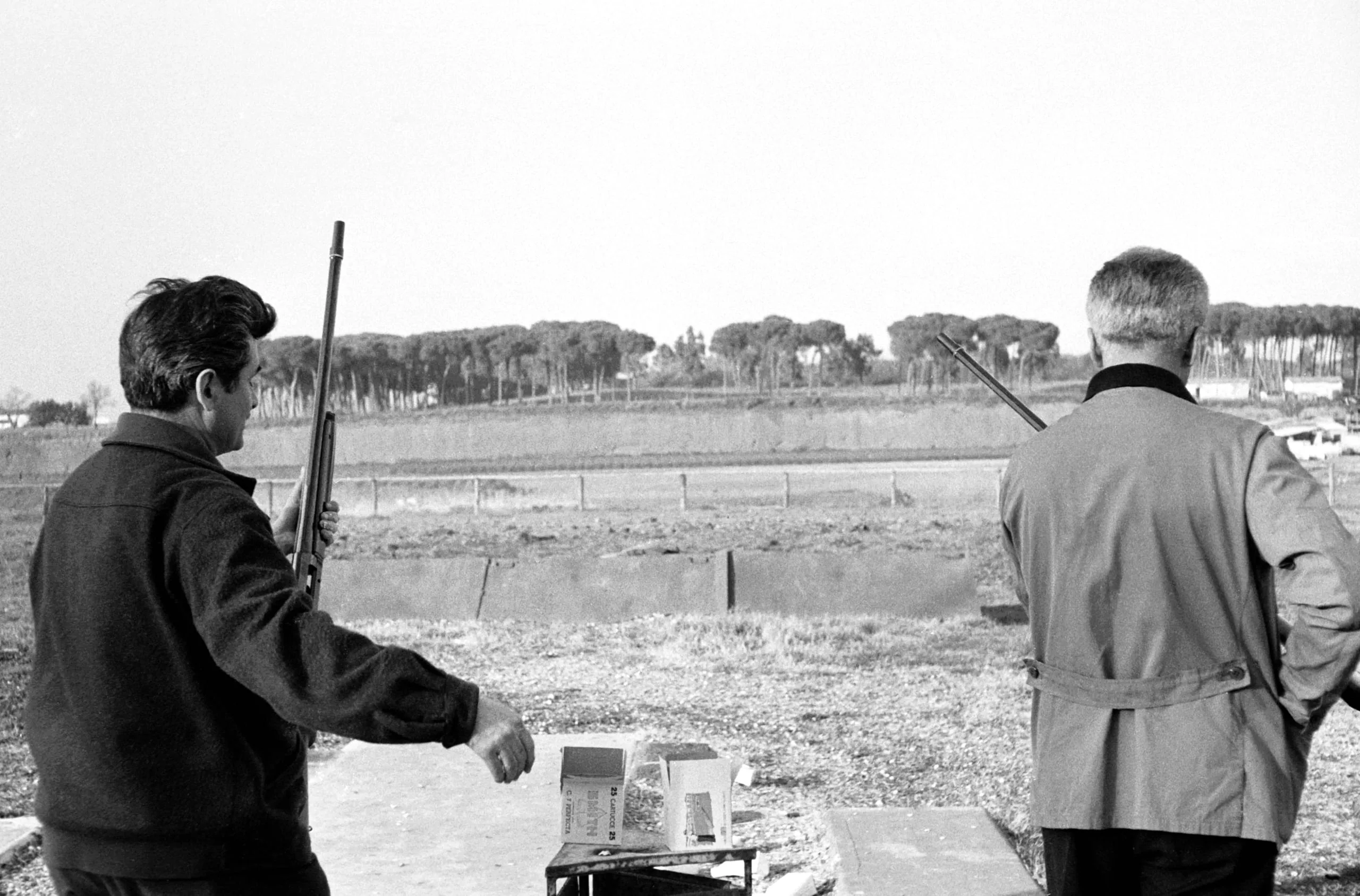 Black and white photograph of two men seen from behind, each holding a rifle upright, standing before a flat landscape with tall pine trees
