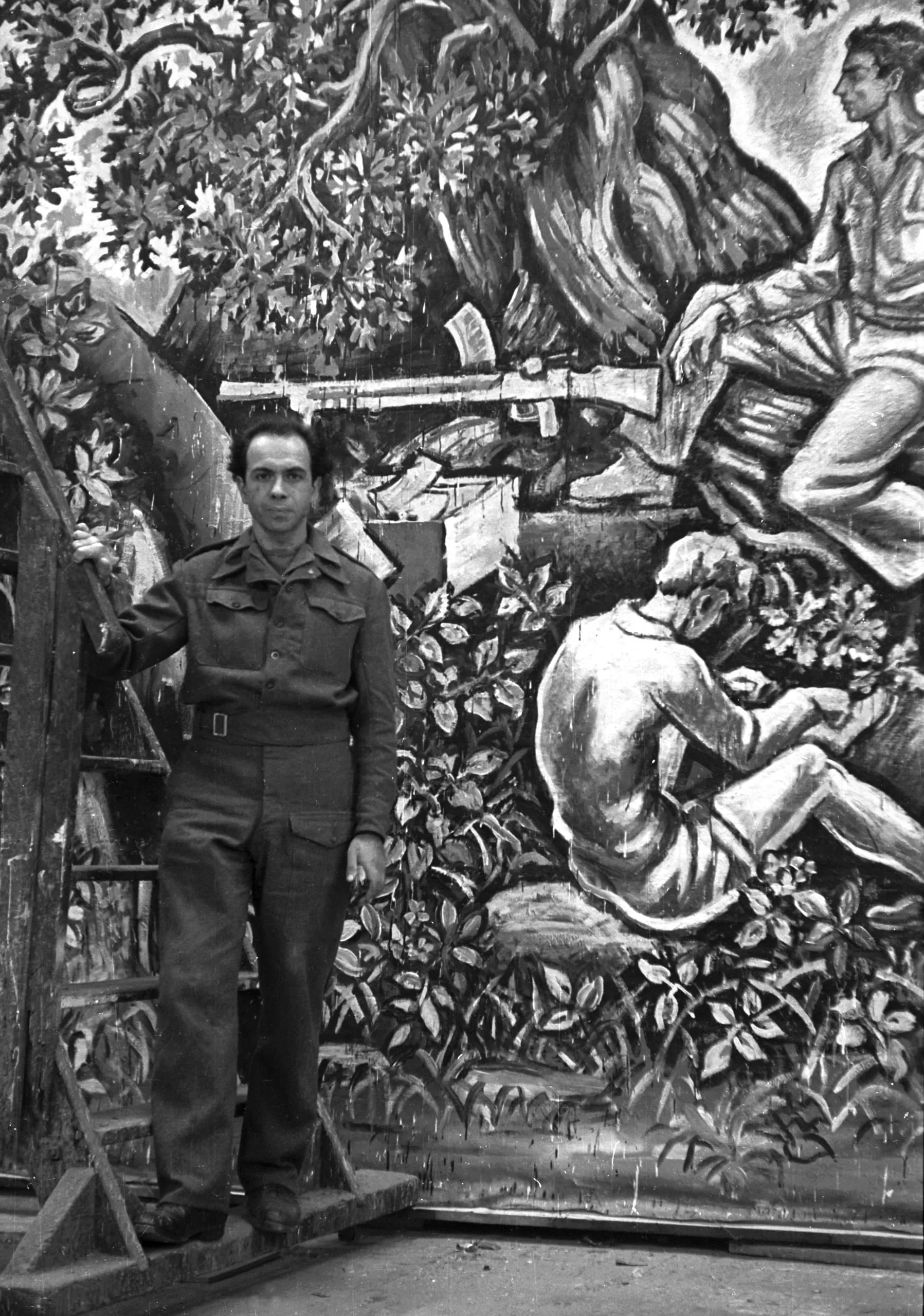 Black and white photograph of a man in military uniform standing before a large painted mural depicting armed figures among dense foliage