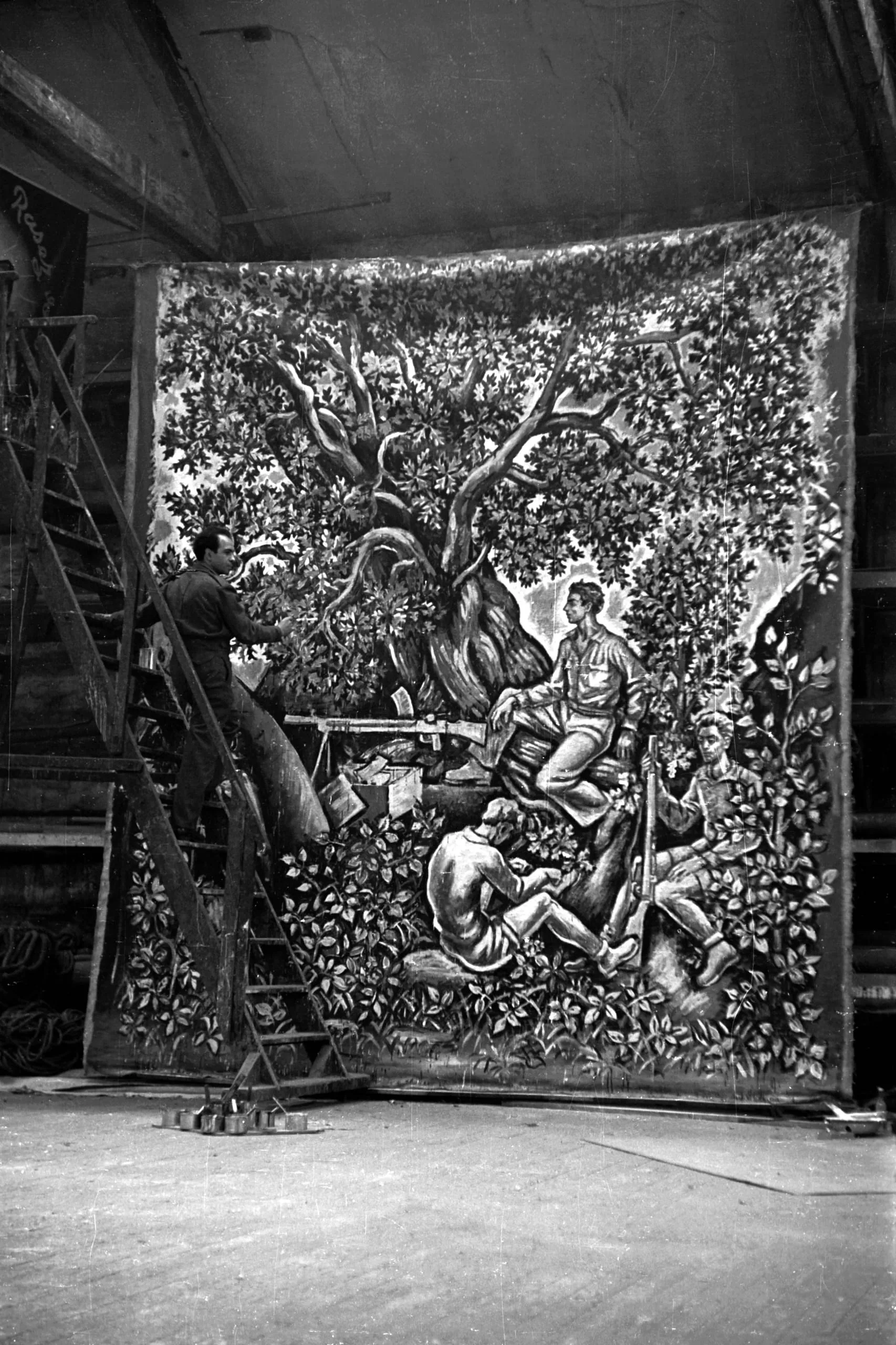 Black and white photograph of a man on a wooden ladder working on a large painted mural depicting figures beneath a wide, sprawling tree, photographed in a studio or workshop space