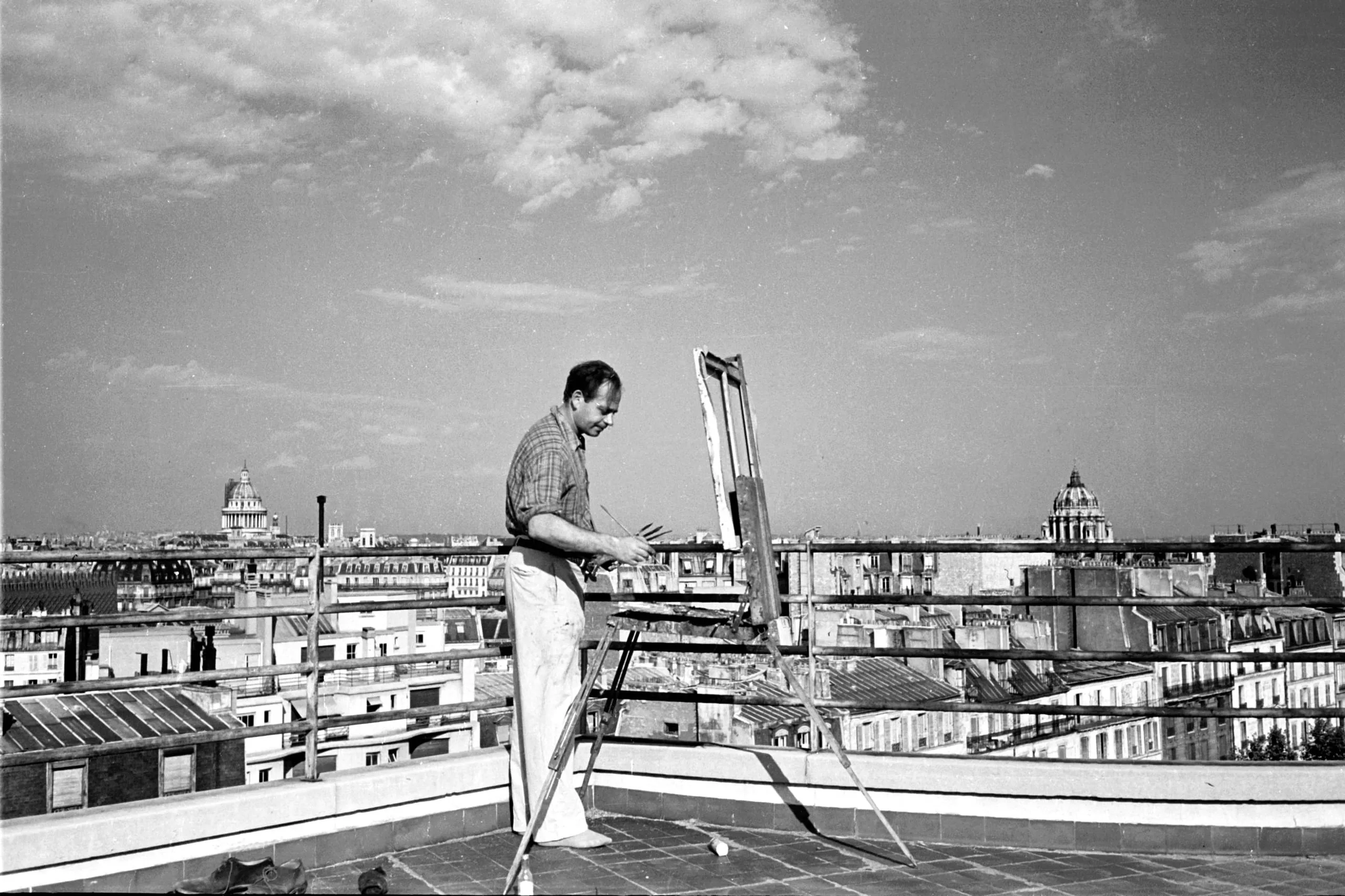 Black and white photograph of a man with brown skin painting at a rooftop easel, with a Parisian skyline and two large domes visible in the distance