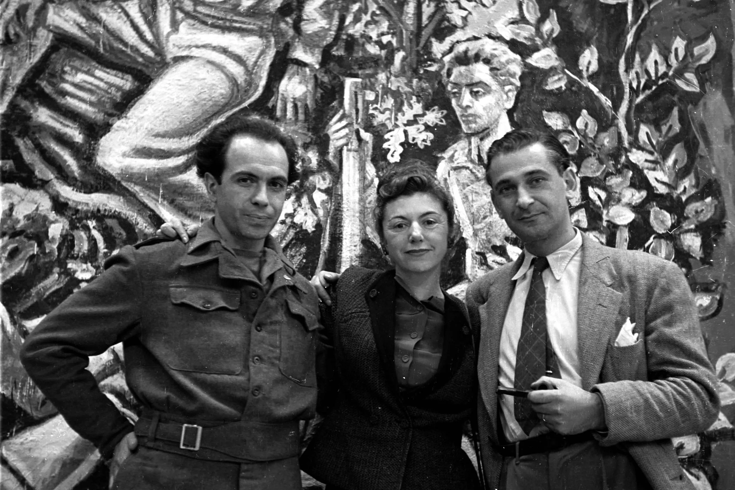 Black and white photograph of two men and a woman standing together in front of a large expressionist painting, all facing the camera