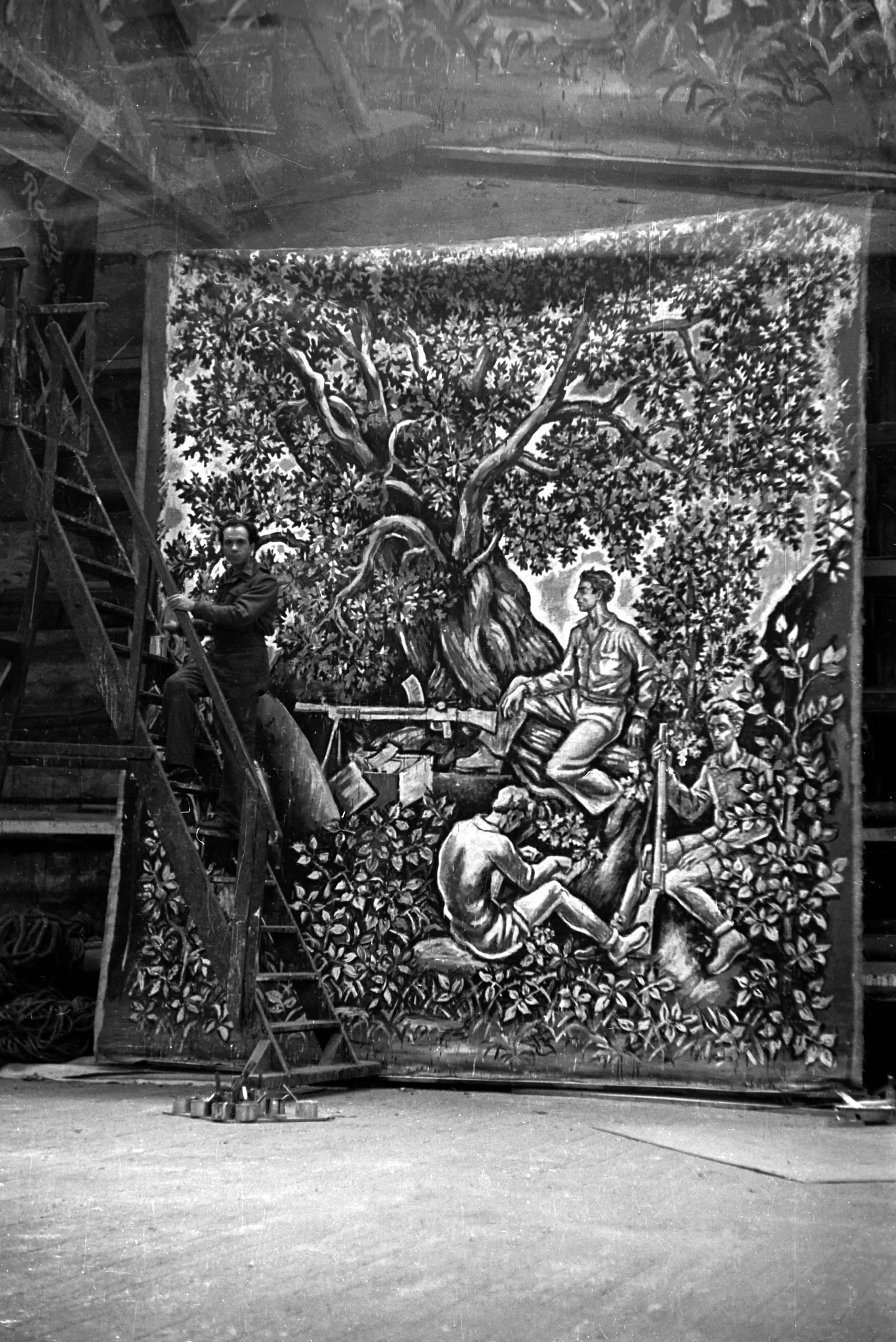 Black and white photograph of an artist on a stepladder beside a large canvas painting depicting three figures with rifles sheltering under a dense tree