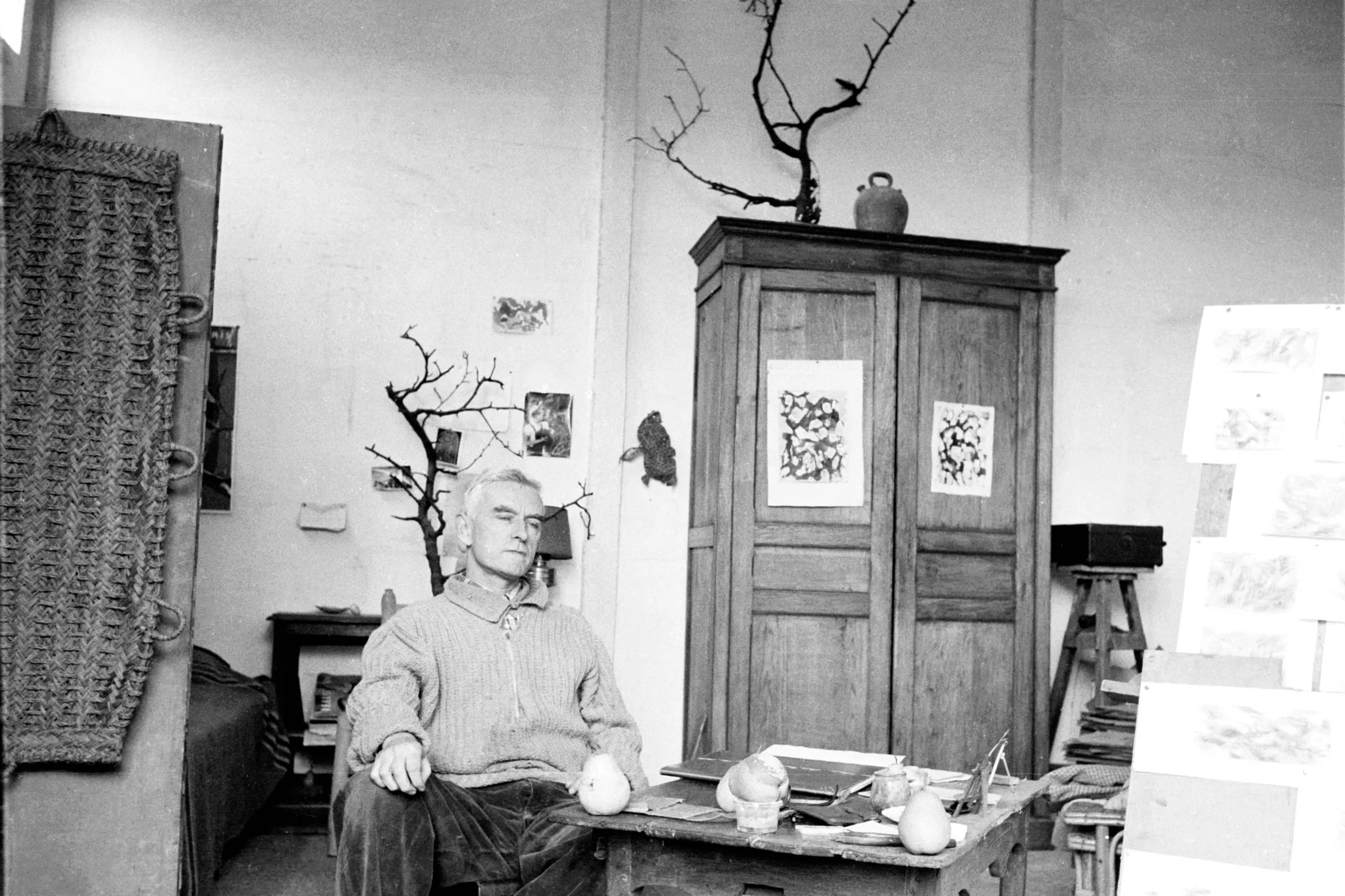 Black and white photograph of an older white man seated at a worktable in an artist's studio, surrounded by dried branches, a wooden armoire with pinned drawings, and a woven textile