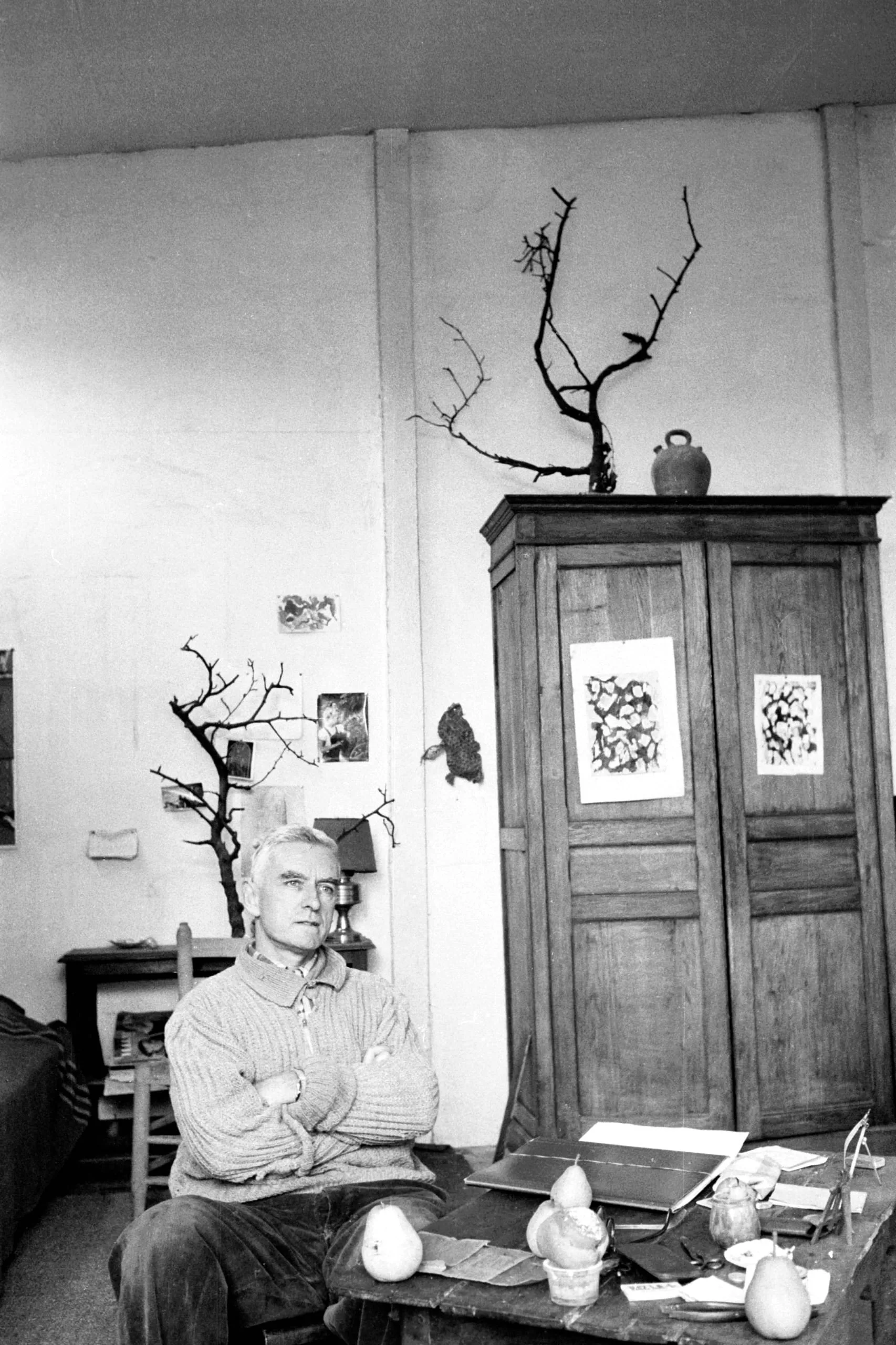 Black and white photograph of a white man seated with arms crossed at a worktable in a studio, a large wooden armoire and bare sculptural branches behind him