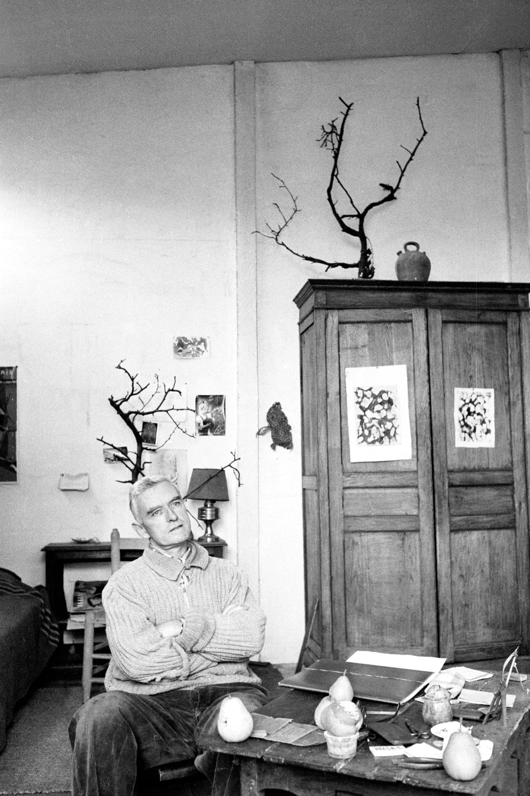 Black and white photograph of a gray-haired man seated with arms crossed in a studio, surrounded by bare branches, a wooden armoire with pinned drawings, and objects on a low table