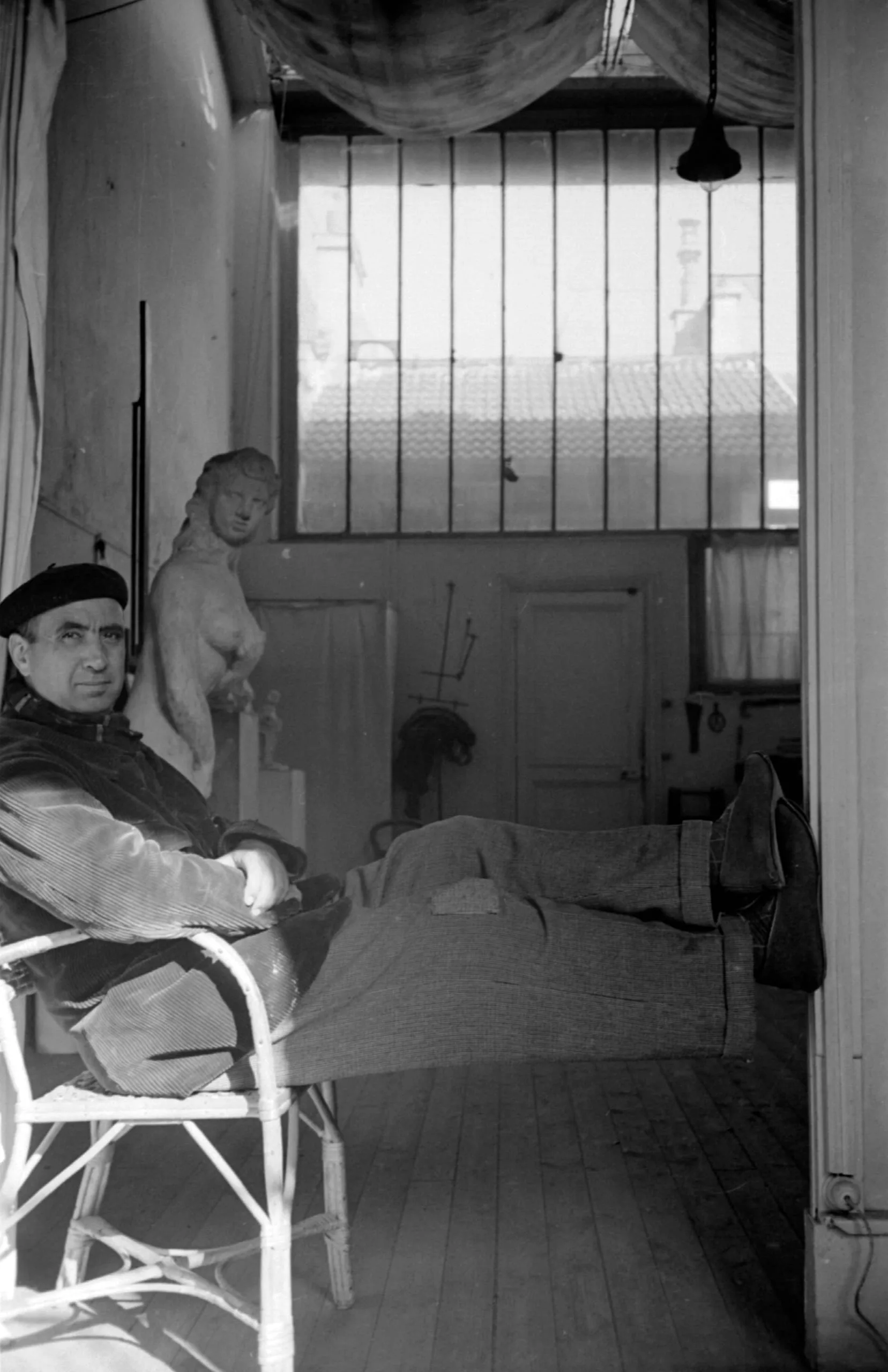 Black and white photograph of a man in a beret seated in a wicker chair inside a sparse room, with a nude figurative sculpture standing behind him and a barred window in the background