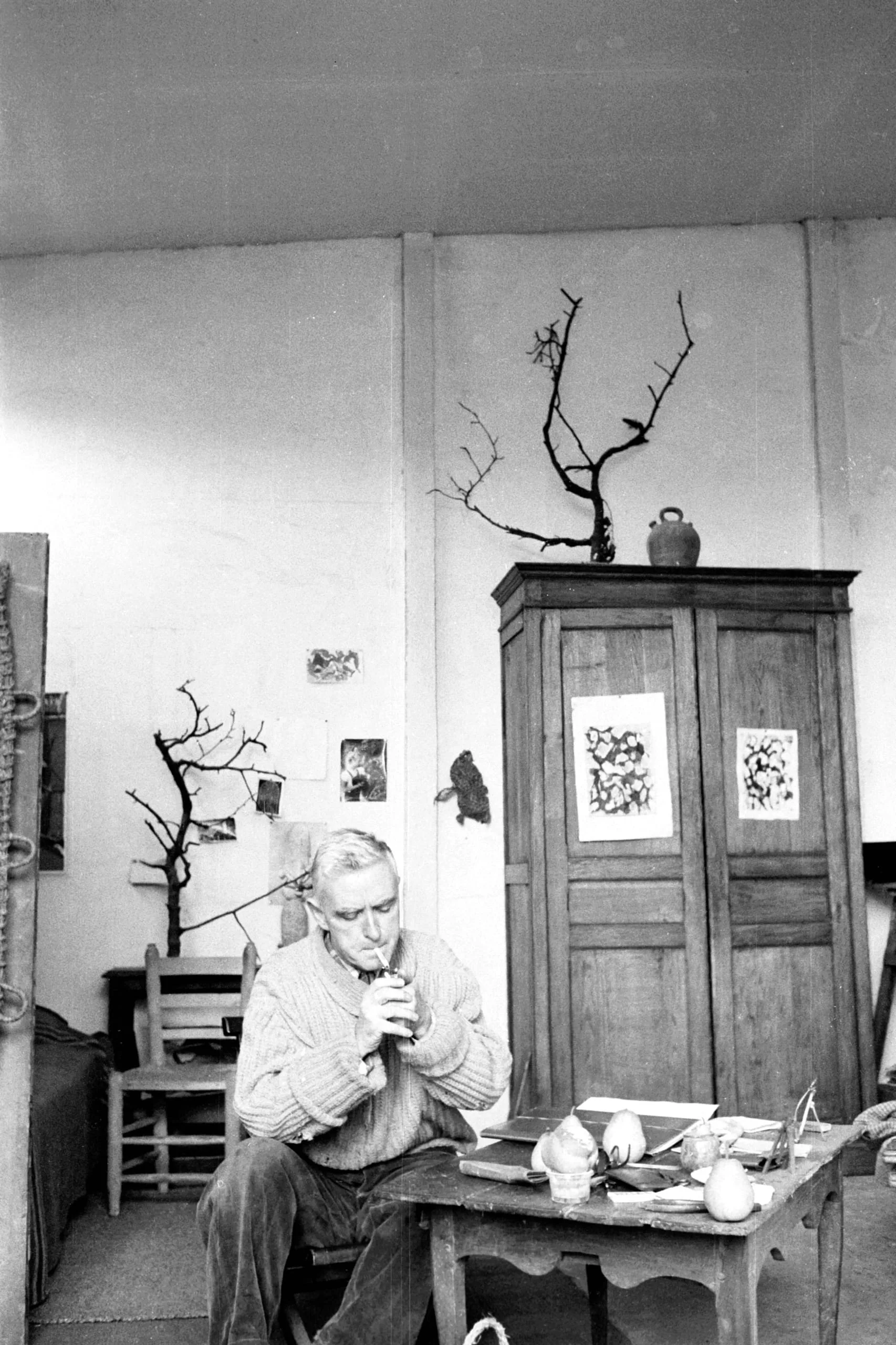 Black and white photograph of an older man in a knit sweater sitting at a worktable in an artist's studio, surrounded by bare twigs, ceramic objects, and pinned drawings
