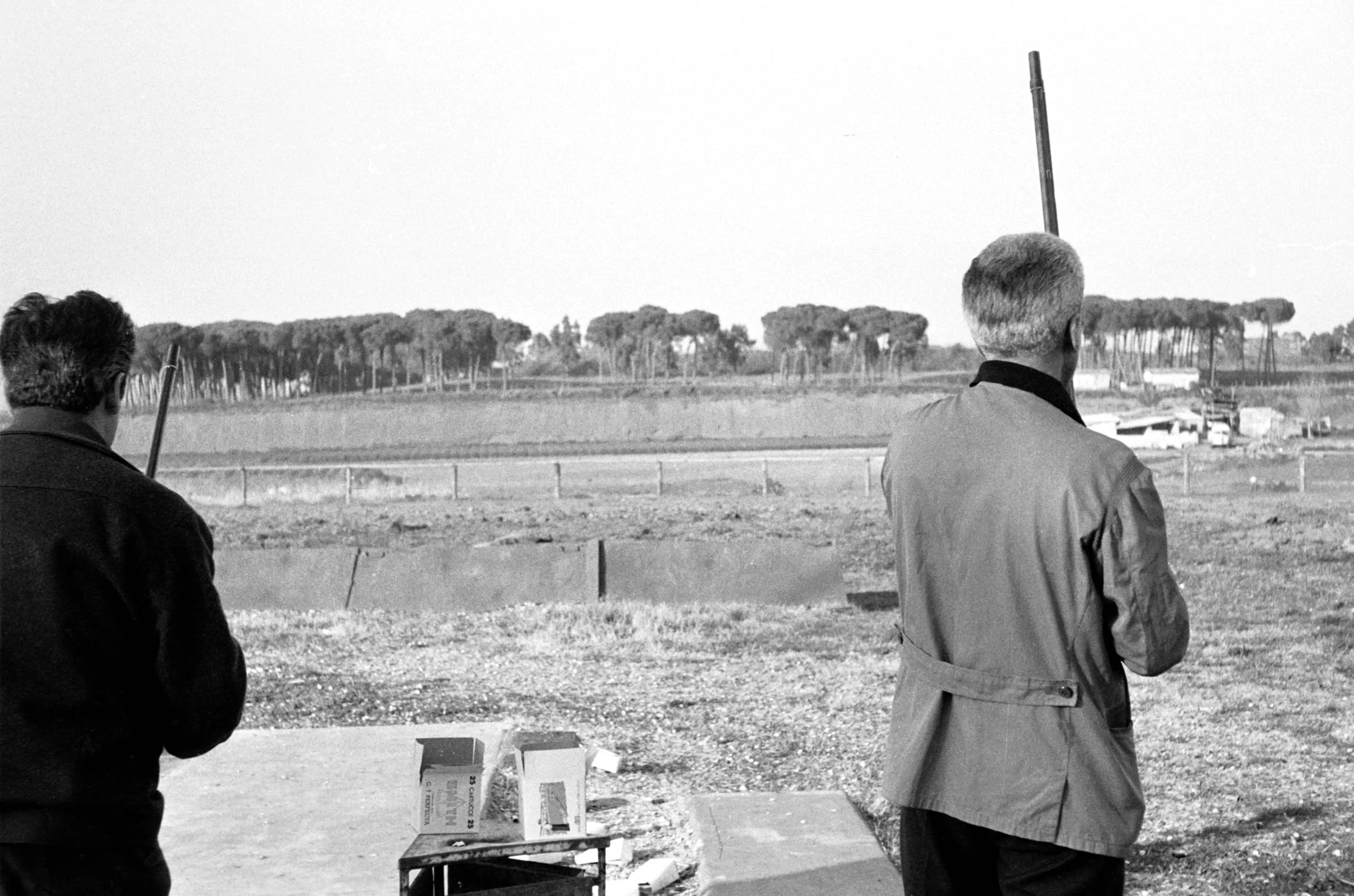 Black and white photograph of two men standing with their backs to the camera, each holding a long firearm upright, overlooking a flat rural landscape with a row of tall pine trees in the distance