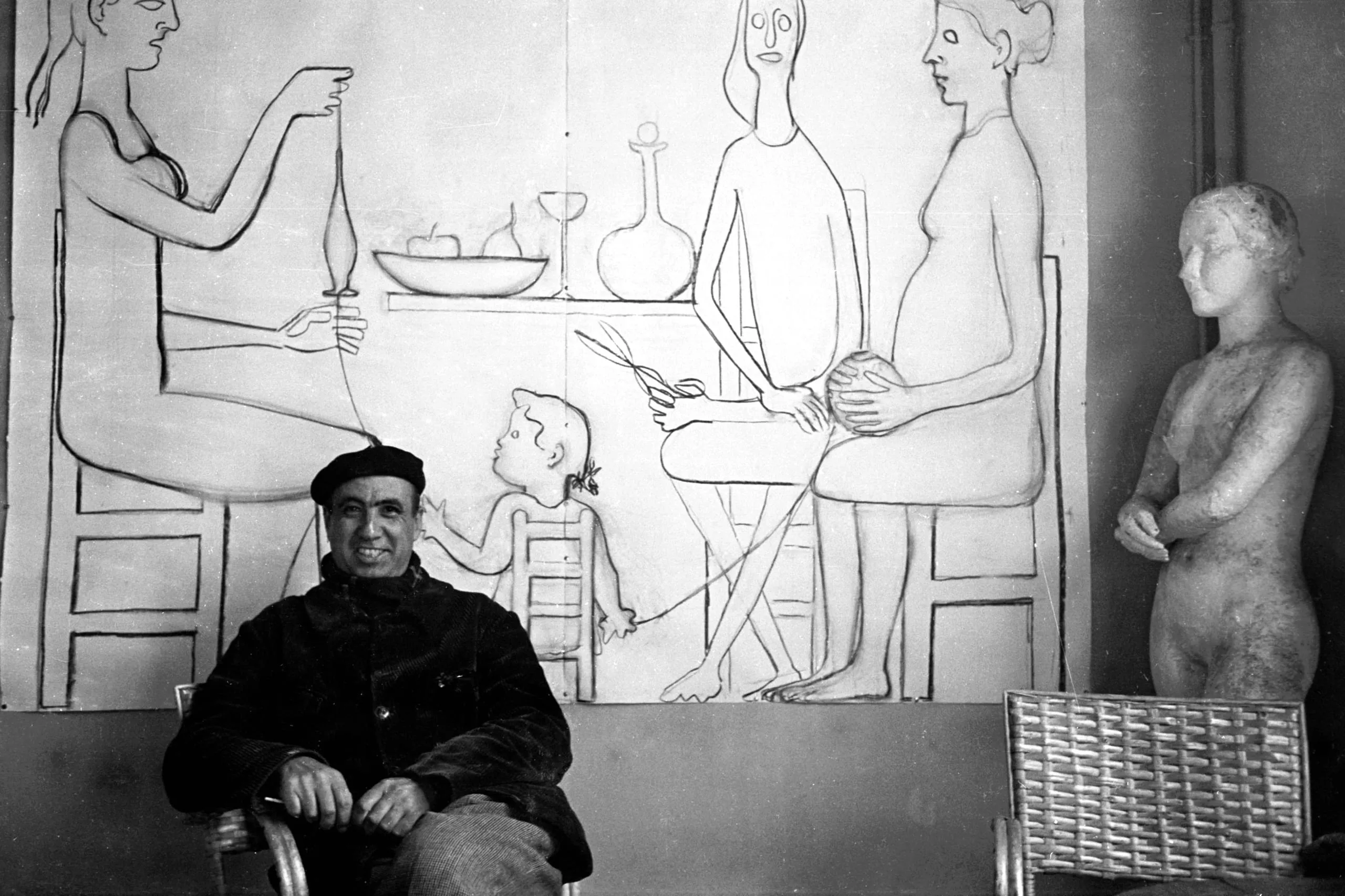 Black and white photograph of a smiling man in a dark beret and jacket seated before a large wall mural of stylized figures, with a rough-textured standing nude sculpture to the right