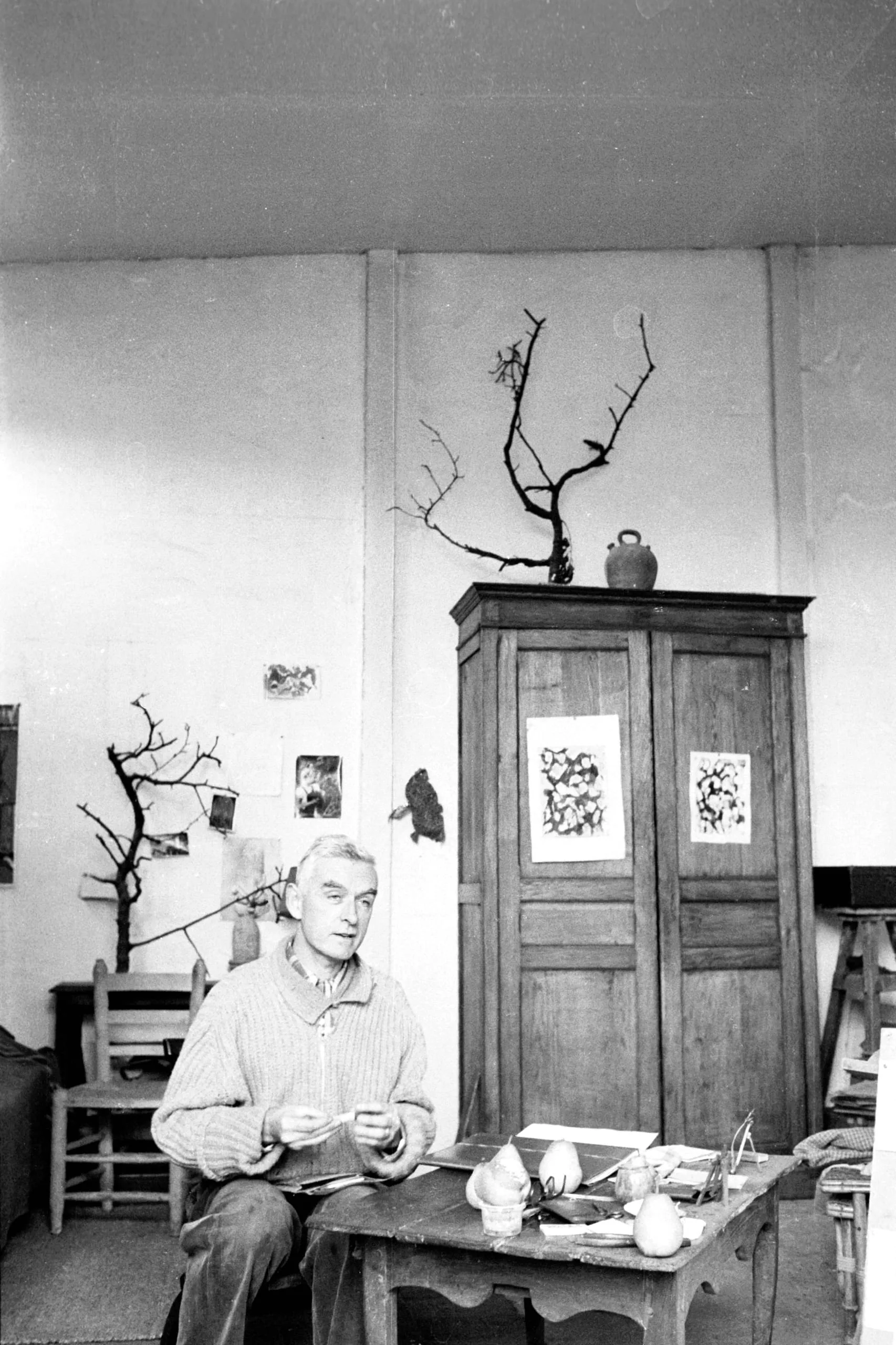 Black and white photograph of a man seated at a worktable in an artist's studio, surrounded by bare branch sculptures, a wooden armoire, and pinned drawings