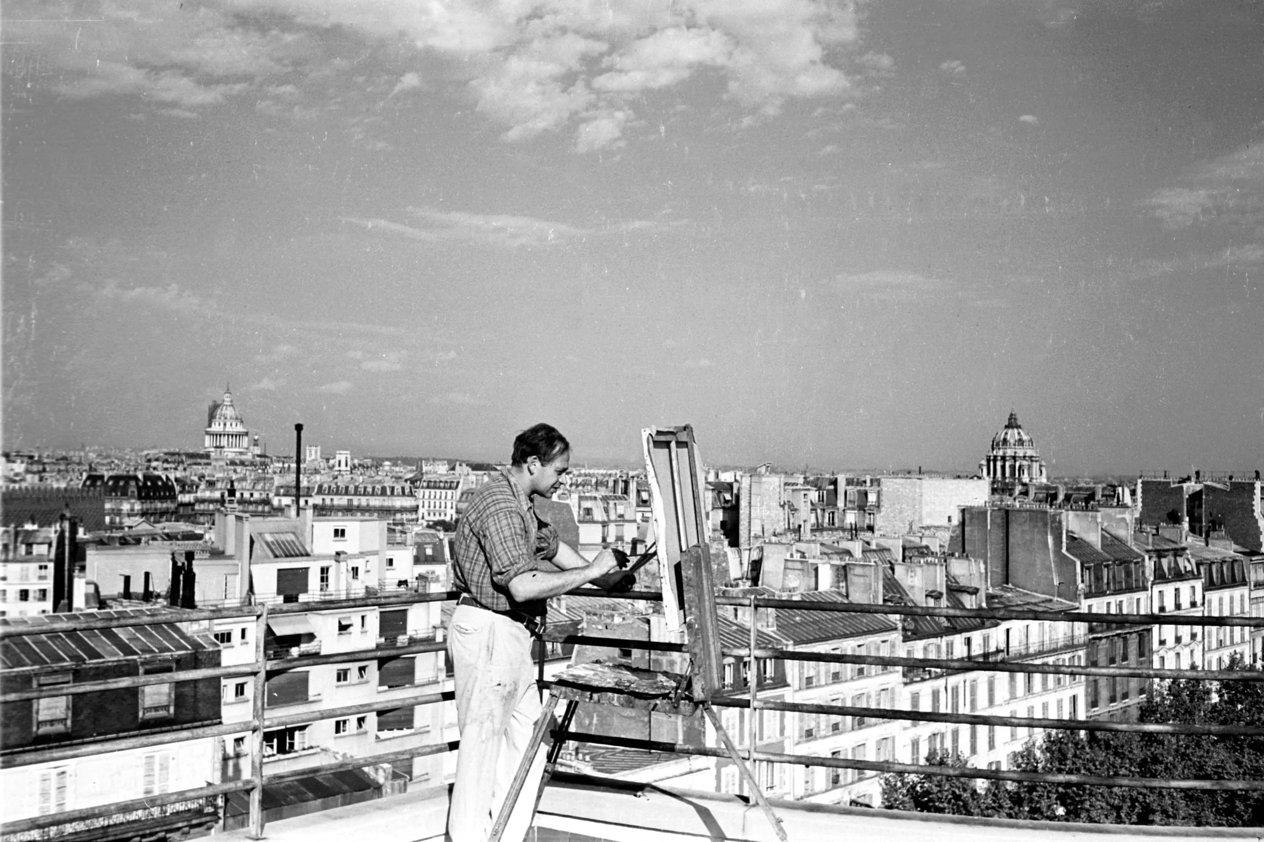 Black and white photograph of a man in a plaid shirt painting at an easel on a rooftop, with a Paris cityscape and two domed buildings on the horizon behind him